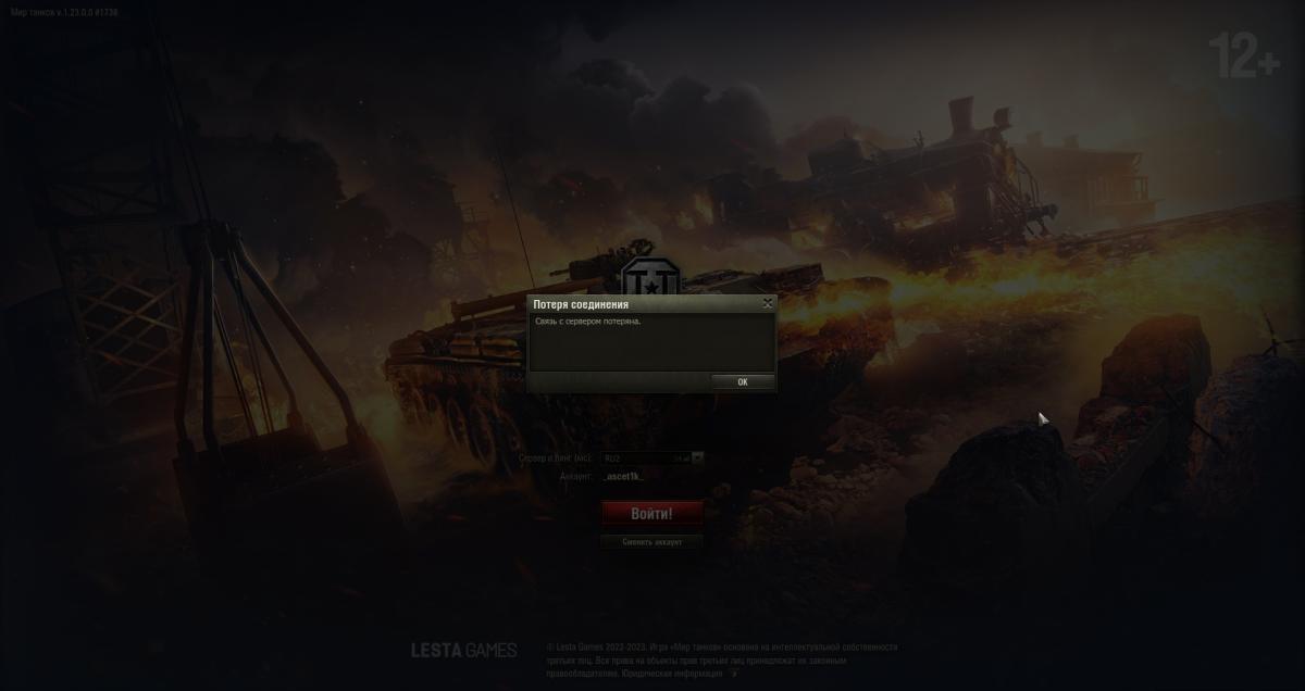 Потеря соединения с сервером. И такое только в Натиске... В случайных боях и Полигоне все нормально, хз, с чем это может быть связано. Вот, скринил один из таких боев - карусель танков для выбора под карту не прогружается, лампочка пинга все время горит красным, и через несколько секунд отключает от сервера