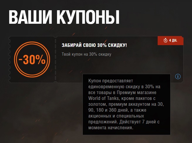 "Отличный" подарок от WG... Купон, который не вариант ни на что потратить. Золото не купишь, премиум купишь только на 1, 3 или 14 дней (такая себе выгода). Технику купишь только ту, которая введена на постоянной основе в прем магазин и которая скорей всего не нужна или давно имеется на аккаунте. Хотел купить Progetto M35 mod. 46, который ввели на неделю в прем магазин... и того не могу купить по скидке... Дайте скидку лучше на "успокоительные" в аптеке... А то месяц не заходишь в игру, и после первого же боя "улетаешь в стратосферу"...