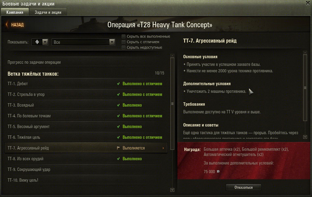 Вчера столкнулся с проблемой. Выполнял ЛБЗ на ветку тяжёлых танков, задание "ТТ-7. Агрессивный рейд" на Т28 Heavy Tank Concept. По результатам боя: "Захватчик", "Боец", нанесённого урона на 4265. Т.е. по факту выполнение и основной задачи и дополнительных условий, а в зачёт задание не ушло. Может я чего-то не догоняю? Союзников не повреждал, один раз на захвате было сбитие, но базу взял в одиночку. Реплея, к сожалению, нет - выцарапываю фпс по крохам. http://cdn-frm-eu.wargaming.net/wot/ru/uploads/monthly_02_2015/post-1009395-0-82704500-1424086075_thumb.jpghttp://cdn-frm-eu.wargaming.net/wot/ru/uploads/monthly_02_2015/post-1009395-0-11259100-1424086086_thumb.jpghttp://cdn-frm-eu.wargaming.net/wot/ru/uploads/monthly_02_2015/post-1009395-0-39551900-1424086093_thumb.jpghttp://cdn-frm-eu.wargaming.net/wot/ru/uploads/monthly_02_2015/post-1009395-0-78513400-1424086100_thumb.jpg