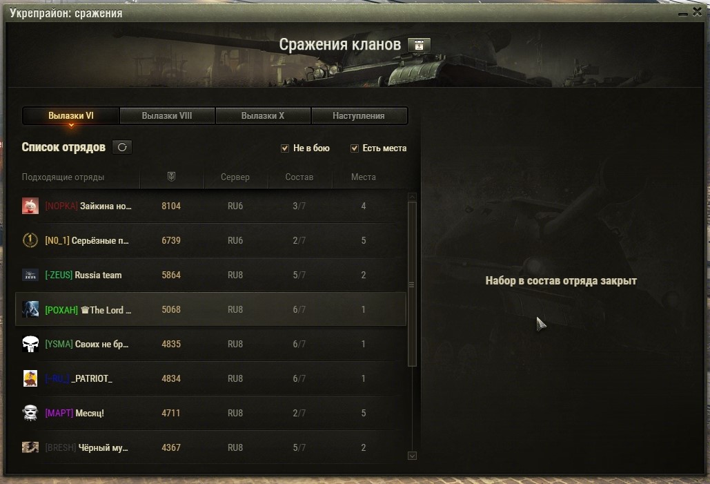 Уважаемые разработчики, Столкнулся с такой проблемой ... Захожу в Укрепы поиграть, минута-две и там, где отображается набор в отряды появляется надпись "Набор в состав отряда закрыт", причём эта надпись относится ко всем отрядам, даже к тем, в которых на данный момент 1 человек. Нажатие перезагрузки не помогает! Помогает только выйти из Укрепрайона и снова туда зайти, но опять пара минут, затем всё повторяется снова (на скриншоте видно о чём я пишу). Стоят моды Юши (версия Lite), других модификаций нет. В других разделах игры (Рандом, Ранги и так далее, проблем нет). Прошу помочь, а то изредка хочется в коллективе поиграть. )))