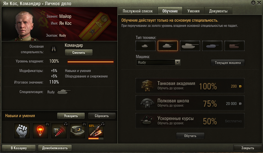 Всем привет. В общем наверное задам вопросы на темы которые уже много раз задавали игроки WG. На дворе благо уже 2019 год, Что-то добавляется, что-то выводится но все же... Уважаемые WG. Вы вообще планируете лечить членов экипажа от "Склероза" ? Да, да, речь пойдет о переобучении членов экипажа на другую технику. Давайте сперва посмотрим в личное дело, любого члена экипажа. Для примера возьму Командира среднего танка Rudy. Здесь нас интересует пункт "Специализация" 1 Само поле, имеет большие размеры по сравнению с самой надписью, которая информирует игрока, на какой технике, Командир может управлять техникой (командовать) без штрафа к навыкам. Само поле, вполне может уместить в свой размеры еще до двух (2) иконок с техникой. Скриншот 1 (фотошоп) 1 (фотошоп) Далее буду отталкиваться от этого скриншота Допустим, всем членам экипажей танков, дать второй слот в "Специализации" (вторая по счету СУ-100) "С возможностью открытия второй специализации за серебро, 100к за одного члена экипажа на новую технику" с сохранением старой специализации (Rudy) и прокаченных перков (навыков, умений). Здесь хочу немного заметить, что экипаж можно переобучить на любую технику, но в рамка нации. А для того чтобы обучить (переобучить) экипаж для третьей специализации (ИС-2) Логично реализовать платное (за голду) открытие третьей специализации. Сумма которой будет равна от 250-300 голды, за одного члена экипажа танка (за серебро не имеет смысла) С одной стороны, это позволит сделать членов экипажей более универсальными. И не выкачивать на каждую технику по экипажу. Прем.техника также станет еще более актуальной в прокачке экипажей (учитывая что она не дает штрафов) Для новичков это тоже вполне хорошое подспорье. Но и стартовое обучение экипажа за 200 голды никуда не пропадет. Хотя учитывая 1 день прем. аккаунта и резервов на опыт членам экипажа (и акций) , это несколько часов, для обучения экипажа до первых прокачиваемых перков (навыков, умений) Так же появляются экипажи с огромной возможностью игры на технике: 5-6-7, 6-7-8, 7-8-9, 8-9-10