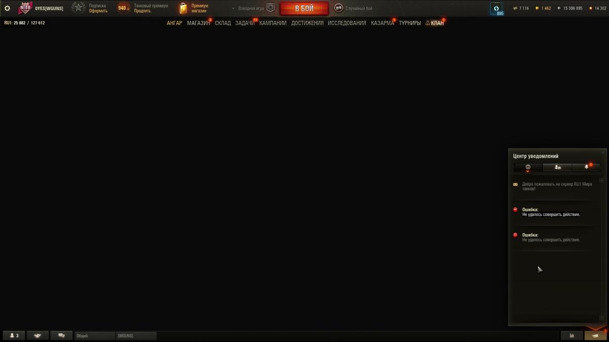При нажатии в ангаре кнопки "Клан", вылазит ошибка - "Не удалось совершить действие." Тем самым невозможно перейти во вкладку клан и активировать резервы...