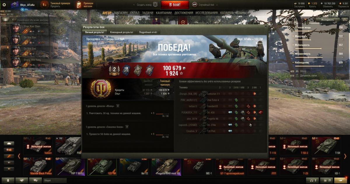 http://cdn-frm-eu.wargaming.net/4.5/style_images/wg/snapback.pngDartdiver (15 фев 2021 - 11:56) писал: Ну как спокойно, на тебя выкатывает исм, ты ему тыку, он тебе тыку, он тебе тыку, ты ему тыку, он тебе тыку, выбираешь на чем ехать в бой в ангаре Угу. Примерно так. По итогу боя 5 выстрелов, 4 попал, 3 пробил. Примерно 1200 урония. После 3-4 боев понимаешь, что вперед ехать просто нельзя ни одному ни вдвоем. Если едешь с СТ, и если их хоть на одного больше , чем противников, то они пытаются ворваться, пишут помоги, ты такой въехал, дал тыку и Ф8 - :"типо подождите 15 секунд, я сейчас перезаряжусь....." Удрать уже не успеешь, и все зависит уже от команды. Да, это чисто пофармить танк. Взял, т.к. есть экипаж с 59-го с перками. И в принципе мне нравится "Т54 1 образец" манерой игры от брони ВЛД. Хы-хы, как там в рекламном ролике про него (Т54) говорилось: "помахивая передней броней" ))) Но к такому КД я не был готов. Ну, что ж, видимо надо учиться играть в СТ от кустов и рельефа. Не всё же во "врывы" как в ББ играть. Башня крепкая. Пришита надежно. К ней вопросов нет. Крепче чем у об.430 (пруф в фото). Шучу конечно, всё субъективно. Но на горке Прохоровки мы с 430 обменивались тычками в мою пользу. Наверное, просто повезло, может он чисто посмотреть подъезжал. Любопытный. А я ему насовал, ни за что )) Но, скоро они поймут куда надо целиться и через пригорочек уже не постоишь. И да, было чудно, что они втроем побоялись съехать к 122 и прожете 46, а в перестрелку через горку, на пол боя, проиграли нашей арте и ТТ с центра.