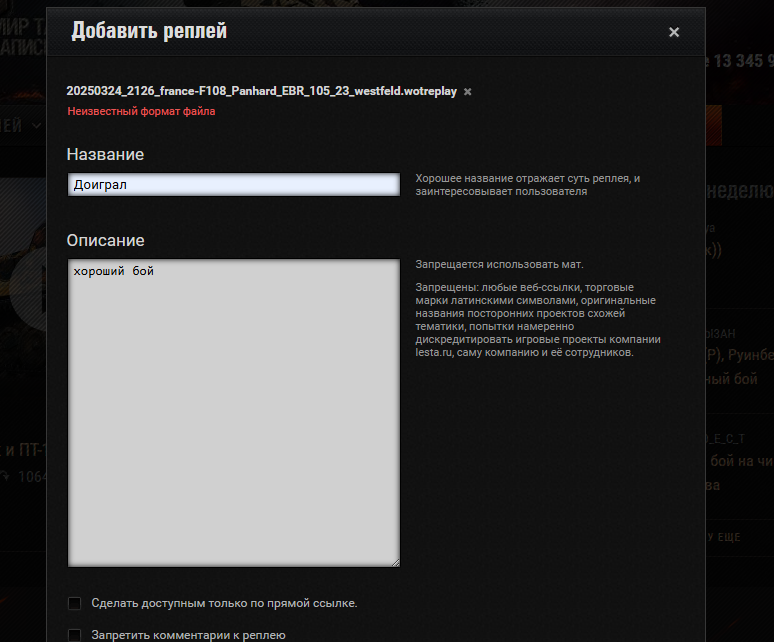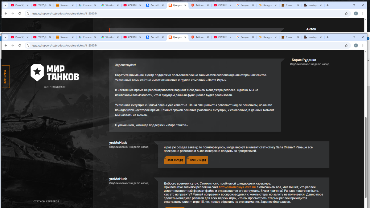 Добрый день, уважаемые разработчики. Столкнулся со следующей проблемой и был очень удивлен ответом ЦПП. Почему за 15 лет существования игры до сих пор не реализован менеджер реплеев, а сайт http://tankireplays.lesta.ru и вовсе оказывается сторонним? Почему что бы просмотреть реплей из прошлого патча необходимо откатывать клиент игры до необходимой версии? Это же просто абсурд! Вы пытаетесь возродить танковый киберспорт, пилите много интересного контента, но базовые вещи Вы пропускаете, или просто не хотите на них обращать внимание. Взять ту же "Аллею Славы", которая была реализована в клиенте игры, сейчас, к сожалению ее функционалом можно воспользоваться только на портале игры в личном кабинете, но там то она работает, Вы либо из клиента ее вовсе уберите, либо допилите.