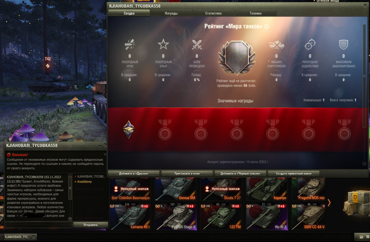 Каждый день наяривают в личку вербовщики, у них 0 боёв на аккаунте. Сделайте ограничение новым игрокам на рассылку личных сообщений в чатах, по количеству проведённых боёв или по добавлению новых адресатов в сутки! По добавлению в друзья только не делайте, а то приглашениями дружить заманают