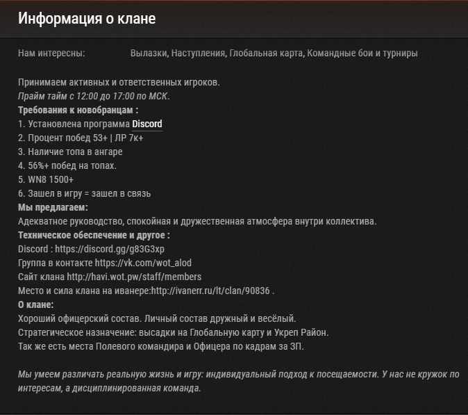 Клан HA_VI принимает активных и ответственных игроков.Прайм тайм с 12:00 до 18:00 по МСК.Требования к новобранцам : 1. Установлена программа DiscordDiscord2. Процент побед 53+ | ЛР 7к+3. Наличие 3 топов в ангаре4. 56%+ побед на топах.5. WN8 1500+6. Зашел в игру = зашел в связьМы предлагаем: Адекватное руководство, спокойная и дружественная атмосфера внутри коллектива. О клане: Хороший офицерский состав. Личный состав дружный и весёлый.Стратегическое назначение: высадки на Глобальную карту и Укреп Район.Так же есть места для Полевого командира и Офицера по кадрам за ЗП.Мы умеем различать реальную жизнь и игру: индивидуальный подход к посещаемости. У нас не кружок по интересам, а дисциплинированная команда.