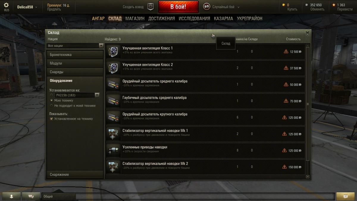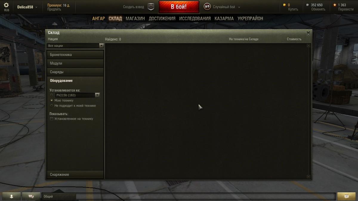Добрый День Всем! Дело в следующем: провел сегодня несколько боев, добрал опыта, исследовал и купил Т54Е1, начал его обувать-одевать, камуфляжи, пушки, аптечки и т.п., дошла очередь до оборудования. Решил посмотреть что у меня вообще есть и вот тебе раз...!!! Со всех ПТ, ЛТ и арты пропали маск.сеть и оптика! Досылатели, стабилизаторы, вентили на месте. Причем на складе их тоже нет, хотя должны быть( получал за разные выполнения заданий). Что это может быть? P.S. Модов нет, в этом обновлении не ставил.