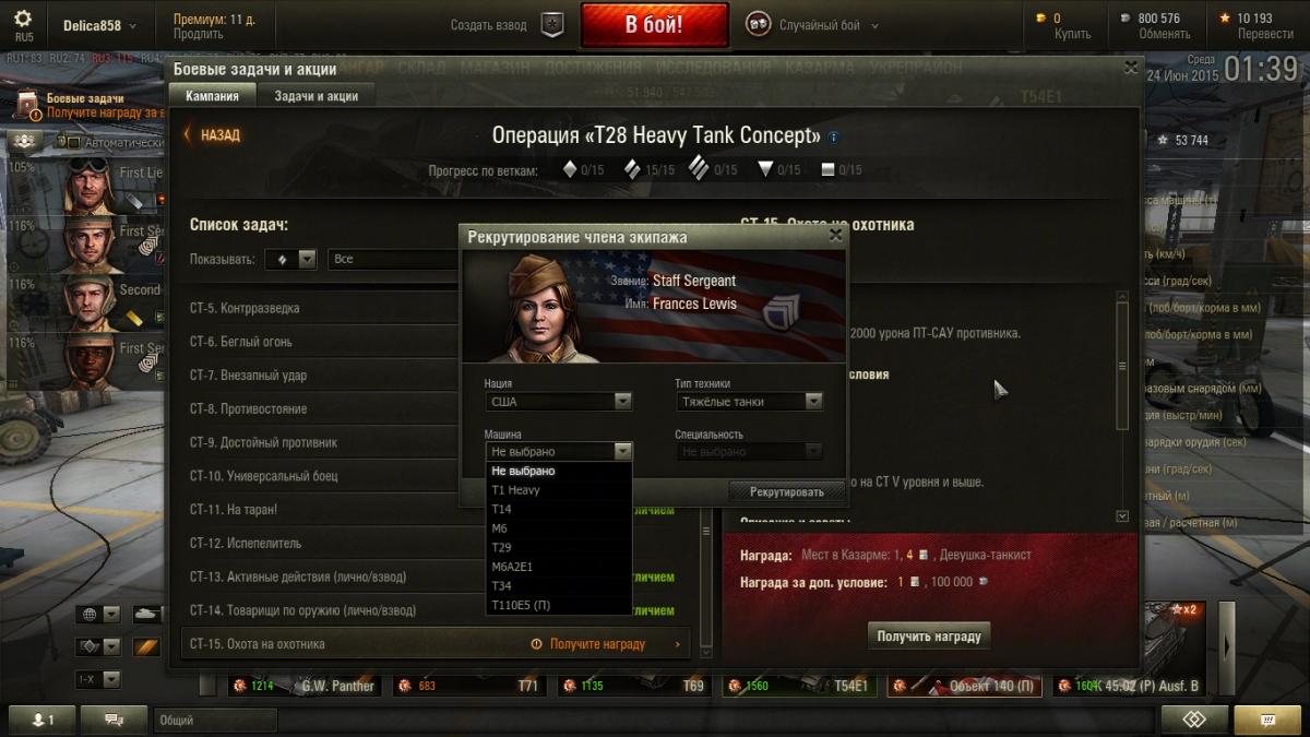 Выполнил одно из ЛБЗ на Т28концепт, получаю награду, рекрутирую девушку. Выбрал американку, потому-что скоро выкачаю Хевика, а в списке техники куда можно рекрутировать Хевика почему-то нет????
