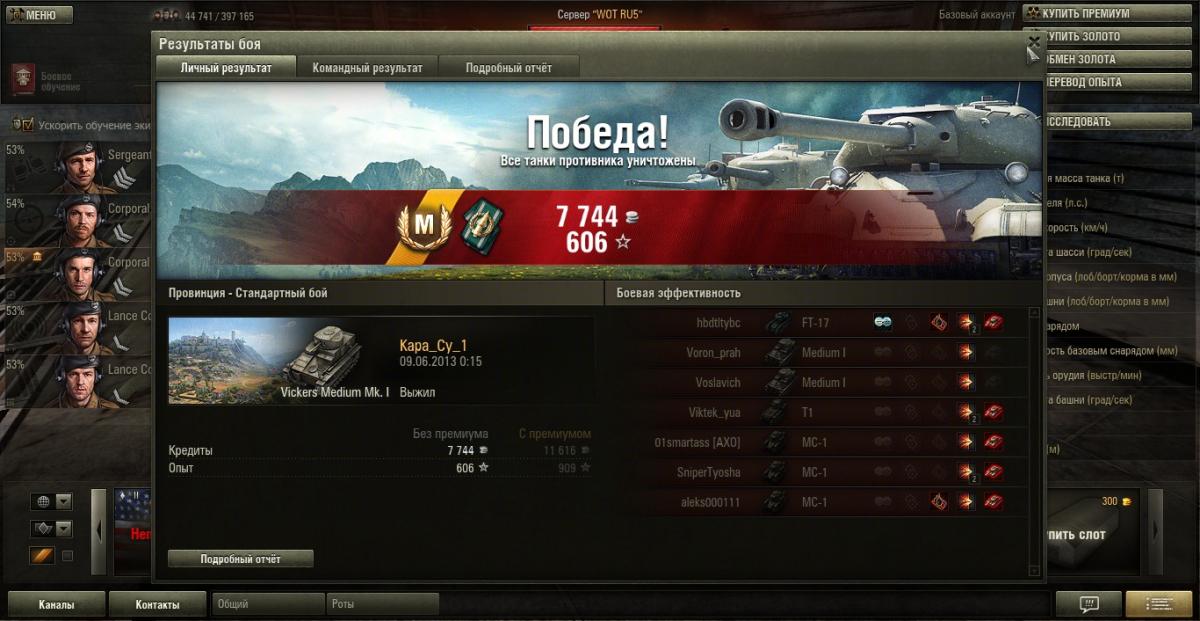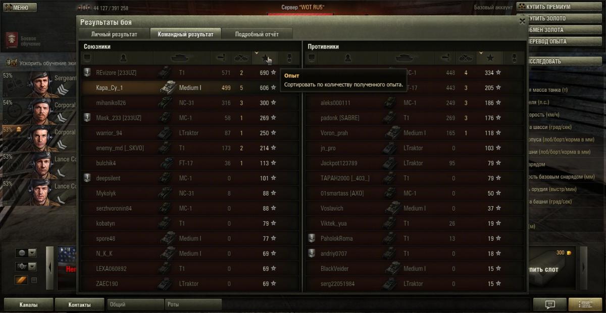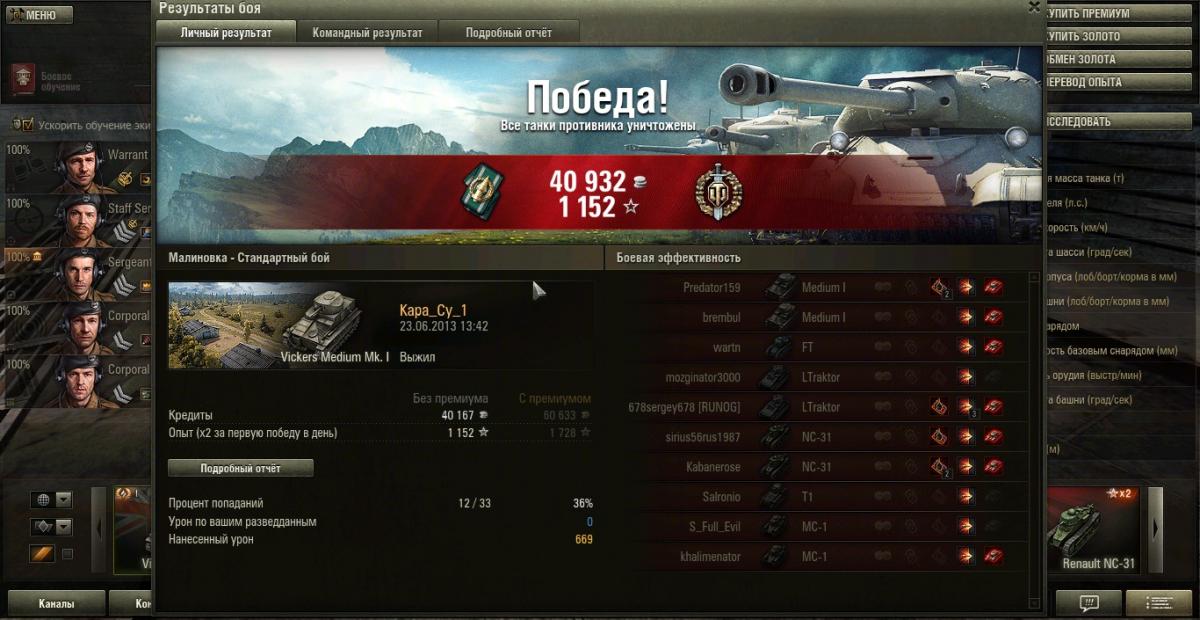 Точно, оличество боёв почему-то не совпадает. Видимо, из-за модов. Поглядел видео на портале про моду, пару дней назад поставил. Кстати, и троих нижних солдат обучил в акцию за 100 золота, до этого ездили с 80% основной специальности...в ущерб статистике. ПАРОЛЕТ, еще раз спс за советы, но бензин и пудинг ведь каждый бой будут тратиться, а серебро я коплю, поскольку мой запасной танк - МС-1 - до сих пор имеет только вентилятор. А от масксети солдаты отказываются. Пока нет доп.умений хотя бы пары штук, хотят с вентилятором ездить. И, они говорят, приводы для них - святое дело, помогают молниеносно свестись на далеких мелких целях на противоположной горе в Провинции, например.