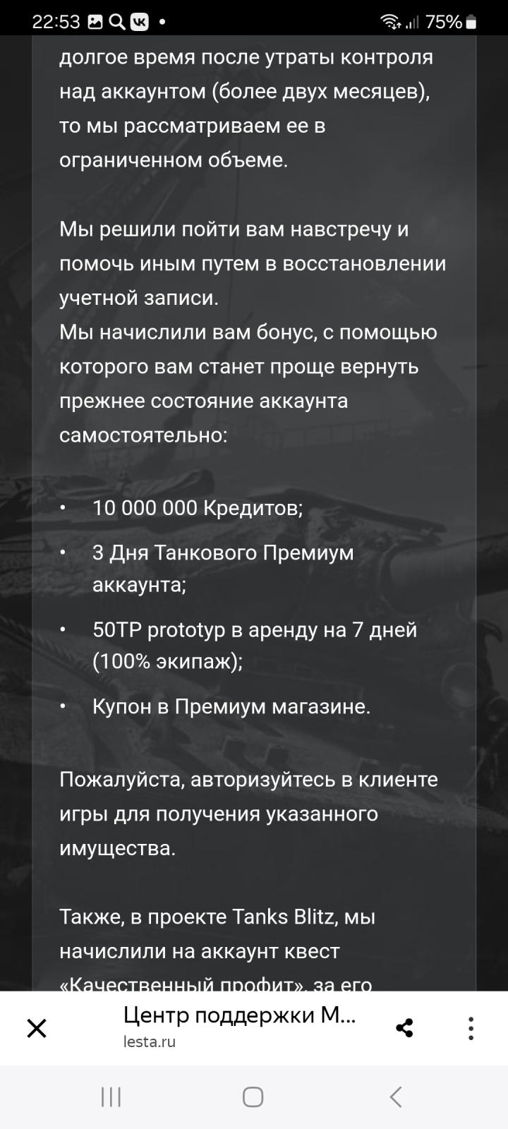 5. И так, моему аккаунту более 10 лет, 21000+ боев, куча 10ок, премов, потраченного времени и денег. В силу занятости рабочей и семейной не заходил около полугода. И тут мы решили с другом вечерком покатать (он мне кидает рефер программу по возвращению, которая работает ЕСЛИ ОТ ПОЛУГОДА НЕ ЗАХОДИЛ В ИГРУ) , захожу с его компа (он на ноут) и вижу полный треш, из 10ок один Тайп 5, немного какой то мелкой, хотя все ветки вкачены остались. Ни Серебра, ни танков!!!!!! Просто треш, катал весь вечер на одном Тайпе 5. По моему мнению баг при переносе с ВГ на Лесту. Взлома никакого не было. На что Леста завуалированно меня шлёт, ссылаясь на какую то активность подозрительную, хотя ни одного пруфа от них нету. Типа компенсируем 3 дня према и 10кк Голды, поржал в голосину И так вопрос, кто сталкивался и что делать?