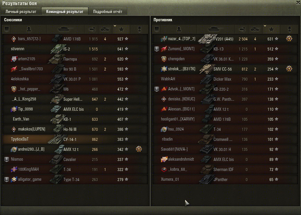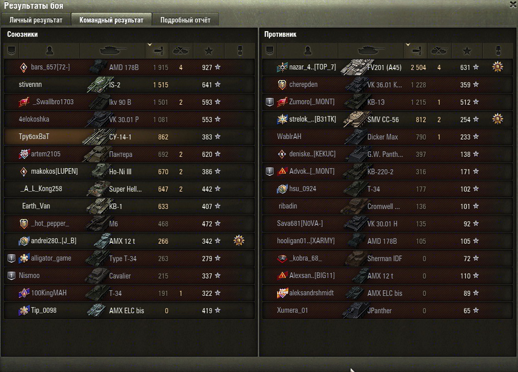Вот это по урону. Сегодня. https://forum-mt-prod.lesta.ru/monthly_10_2025/post-112370191-0-96837900-1759930485_thumb.jpg Вошел в пятерку. А вот это по опыту: https://forum-mt-prod.lesta.ru/monthly_10_2025/post-112370191-0-68425700-1759930594_thumb.jpg Не вошел в десятку. Соответственно - нет очков БП, нет никаких бонусов и плюшек. Вопросы есть? Вы вот тут спорите обо всяком. А ведь от нас в этой игре почти ничего не зависит. Кнопку жмешь, но не знаешь - куда снаряд полетит - перелет или недолет (см. в землю), Если попадешь, то можешь пробить, а может - "Не попал в броню!" (хотя в броню ты как раз и попал, но что толку с этого) Снаряд может и за кирпич какой-нибудь по дороге зацепиться, хотя, по идее, и не должен бы. Но он пропал. Как система решит - так ты и сыграешь. Раз без урона попал, два раза промахнулся, два раза за стенку снаряд зацепился в городе, вот и бой закончился. А за тобой уже приехали, ты на автозахват жмешь, и даже сводишься на противника... но не судьба, опять мимо! В упор А то тебе по трассеру, после первого же выстрела - артолампа сработала, ты отчаянно переезжаешь, но тебе все равно попало. Поиграл. А команда выиграла. Впервые за день.