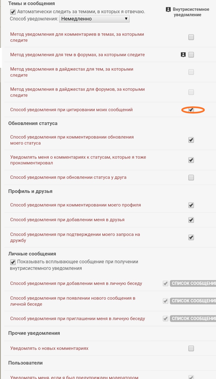 Spoiler Здравствуйте. в настройках сайта не хватает одной настройки уведомлений, или я неправильно настроил? Мне нужно чтобы появлялся значок "Внутрисистемных уведомлений" на главной странице (см. скриншот) только при ответе на мой пост (не только цитата а ответ тоже!!) Никаких других уведомлений мне не надо, типа "при сообщениях в темах которых я писал" и т.п.! Вроде у меня все галочки стоят верно? Но не появляется уведомления когда мне отвечают на пост в теме! нет такой категории?