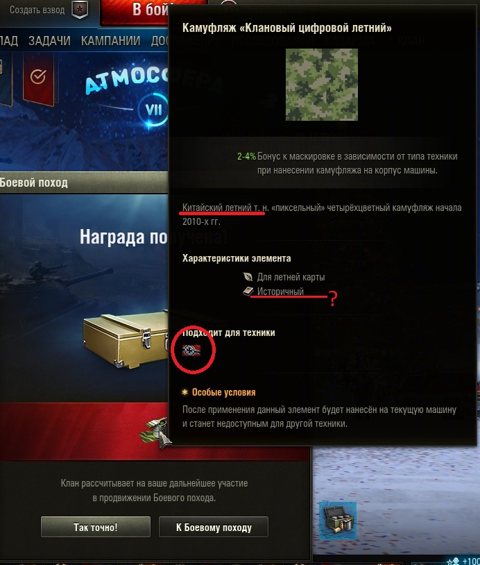 Итак, проблема, которая не решается уже долго: за Боевой поход начисляется камуфляж. НО, проблема с начислением на соответственную технику - китайский не начисляется на китайцев, русский - на русских. Почему я не могу его нанести на соответственную ему технику?