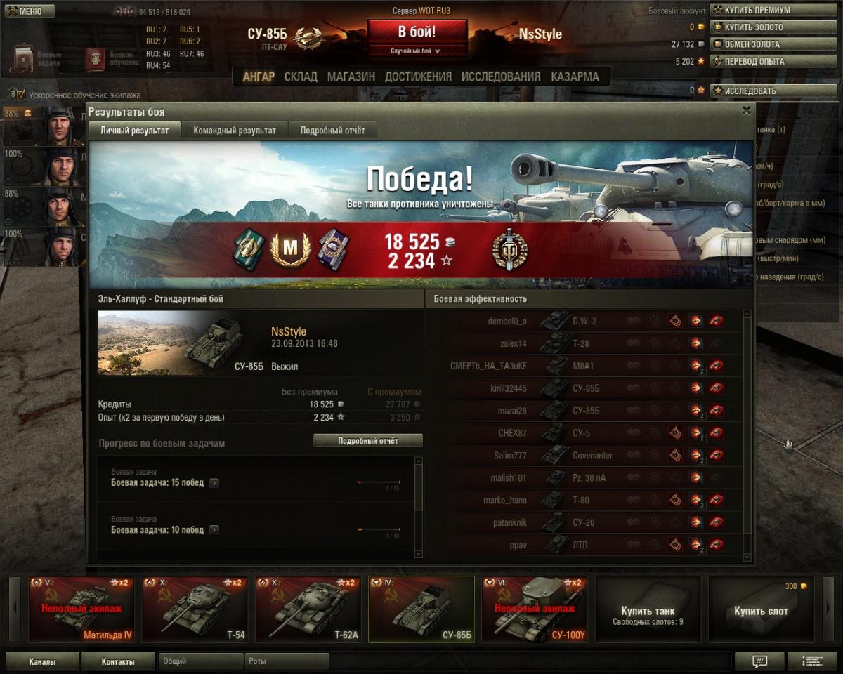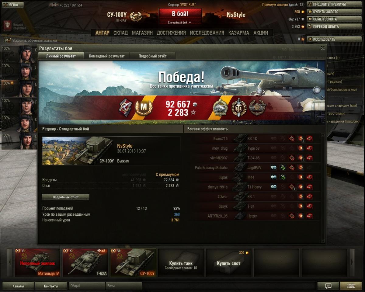 Везет некоторым. А я недавно подходил ко второй отметки 3 раза за вечер: 84.3, 84.2, 84.4% было. Но вдруг ВБР решил поиметь меня и это продолжается уже вторую неделю. Бои ТОЛЬКО с 10-ками, при чем по 7-9 штук в команде. И не важно утро, день или вечер, и смена сервака не помогает. Когда я был в середине списка и чувствовал, что могу напихать половине команды я уже забыл. Вообщем какая то печаль. И урон упал и засвет и попадать перестал http://cdn-frm-eu.wargaming.net/4.4/style_emoticons/wot/Smile_sad.gif А так танк конечно супер. Катаю с досылателем, вентиляцией, оптикой, доппайком, и 4-х перковым экипажем. "Мастер тарана" кстати очень полезный перк http://cdn-frm-eu.wargaming.net/4.4/style_emoticons/wot/Smile_blinky.gif