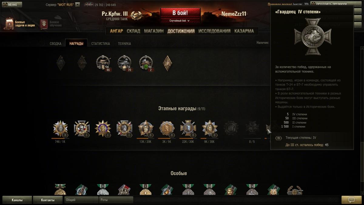2. Этапная награда "Гвардеец". Остановилась на отметке 5 побед и показывает что осталось еще 45 до следующего рубежа, хотя побед на данный момент одержано гораздо больше и все на одном вспомогательном танке. В общем не отображается динамика.