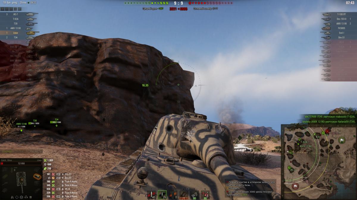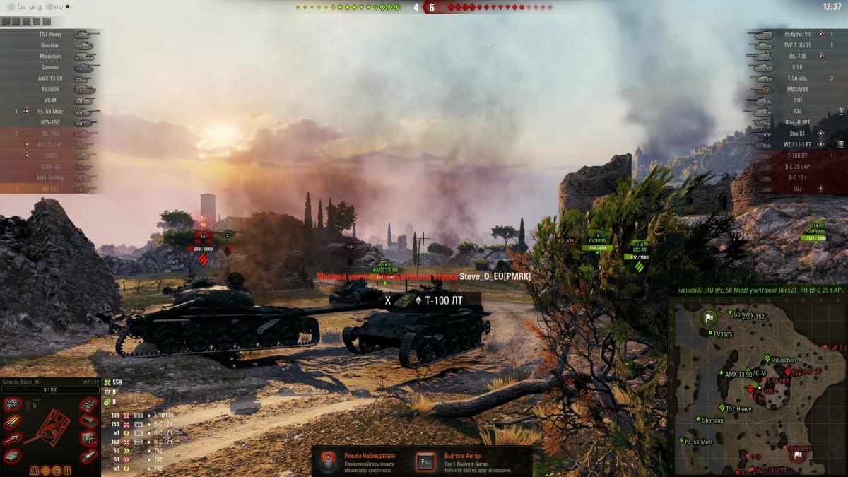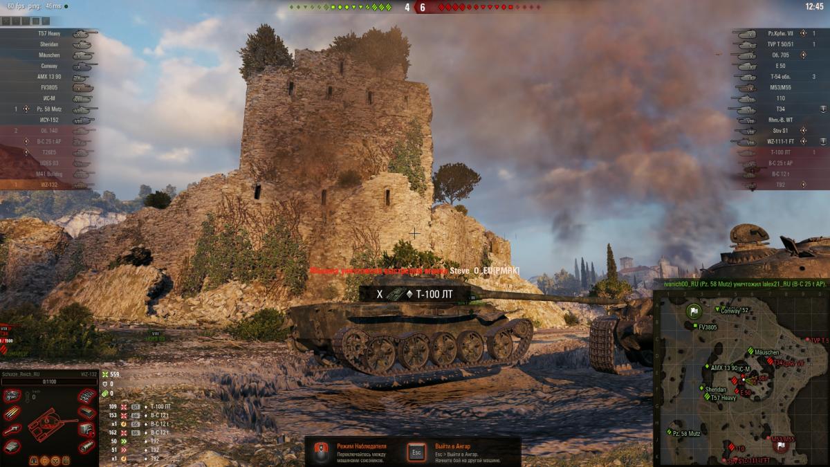 Господа разработчики! Прошу Вас обратить внимание на следующие проблемы которые возникли у меня в режиме Линия фронта: 1. Один раз возникла ситуация что я на батшастике летел по «полю» и врезался в невидимую стену, потом по мне произошёл выстрел от Т-44, он засветился, и оказалось что врезался то я в него. То есть я в упор его не увидел даже врезавшись в него. Реплей не сохранил, так как у меня дико бомбануло и надо было тушить кресло после взорвавшейся пятой точки. 2. Автоприцел. После некоторого времени после захвата танка в автоприцел, последний отваливается, а конкретно башня зависает вместе с кругом сведения, и не отвисает пока не уберёшь автоприцел. Прошу предпринять меры по устранению вышеописанных багов. Спасибо))