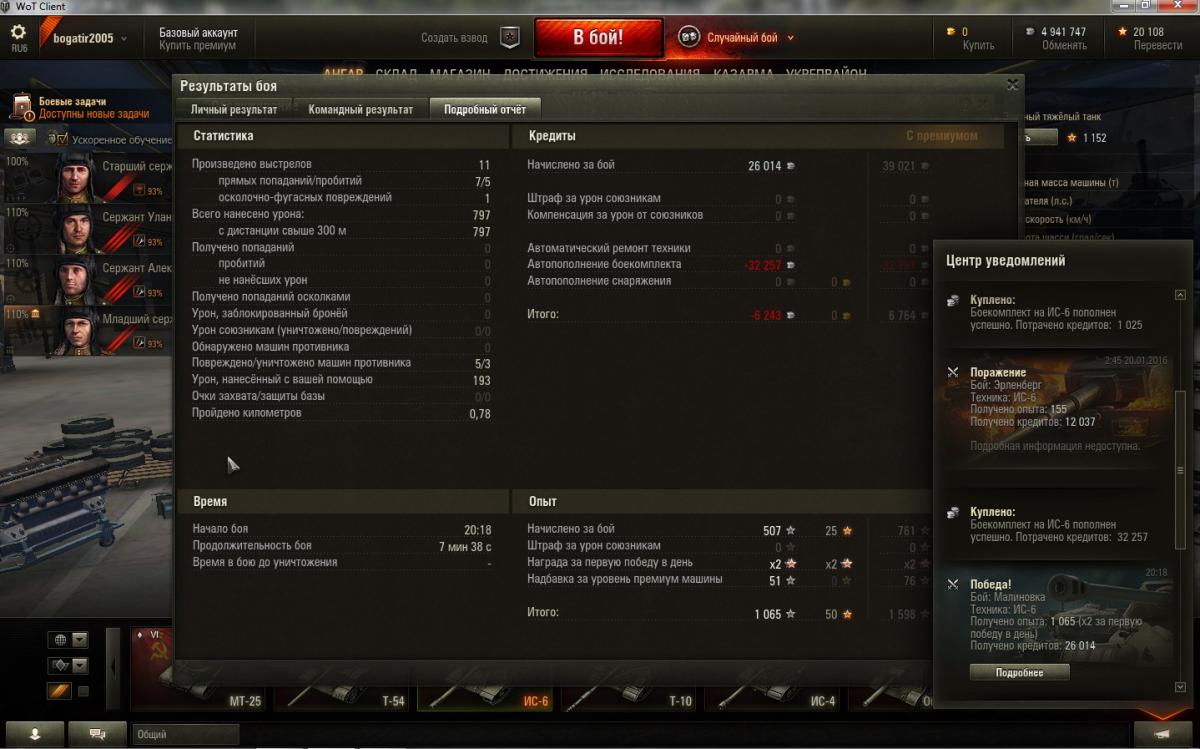 Давно заметил, что с аккаунтом что-то происходит непонятное месяц топчусь на месте. Сегодня зашел в игру сыграл 1 бой на "Малиновке" и результаты поразили. Во первых: ИС-6 5-выстрелов фугасами по 608 =3040, 6-выстрелов ББ х 1025 = 6150 итого 9190, по результатам боя ПОБЕДА,РЕМОНТ - 0, ПОПОЛНЕНИЕ СНАРЯЖЕНИЯ -0 на пополнение боеприпасов списали 32256 получено кредитов 26014 итого -32256 = -6243 это на премиум машине которая раньше даже при полном поражении давала +. Во вторых: в центре уведомлений появилась информация что сыгран еще какой-то бой на ЭРЛЕНБЕРГЕ с поражением. БОНУСОВ 12037, РЕМОНТ 7595, БОЕКОМПЛЕКТ 1025, открыть подробные результаты невозможно. Хотелось бы узнать у разработчиков, почему такое происходит?