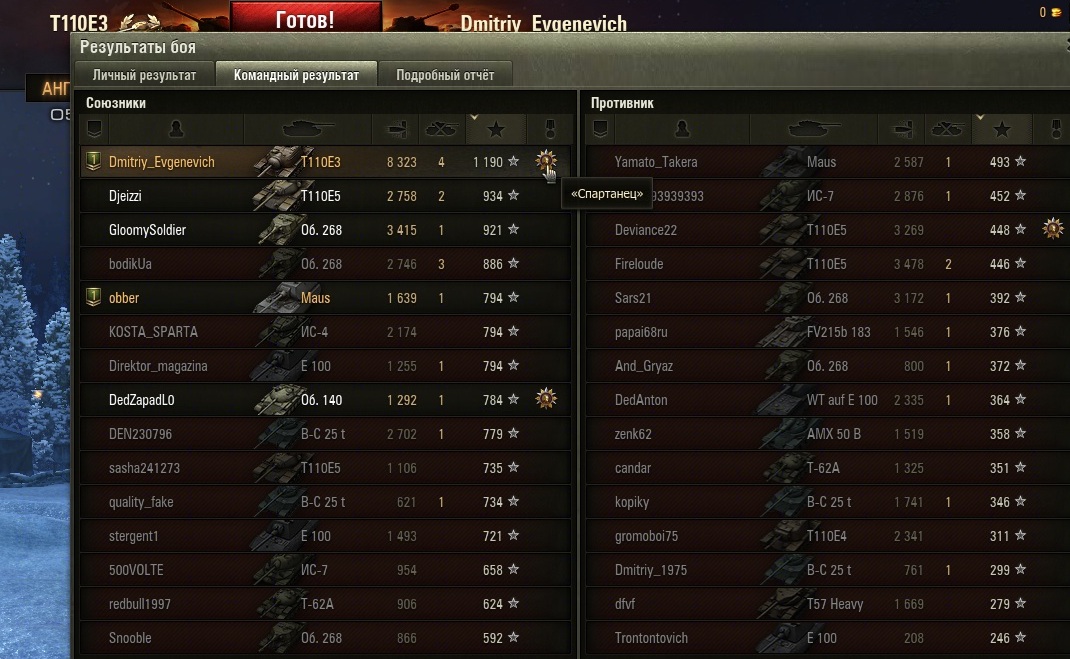 Не знаю как ты с такими показателями за бой "мастера" взял. Стараюсь уже очень давно и всё мало получается, "бредовые понедельники" не помогают! Вот кстати только что бой, показатели как у тебя практически - дали только "стрелка" и "снайпера", смех! =(