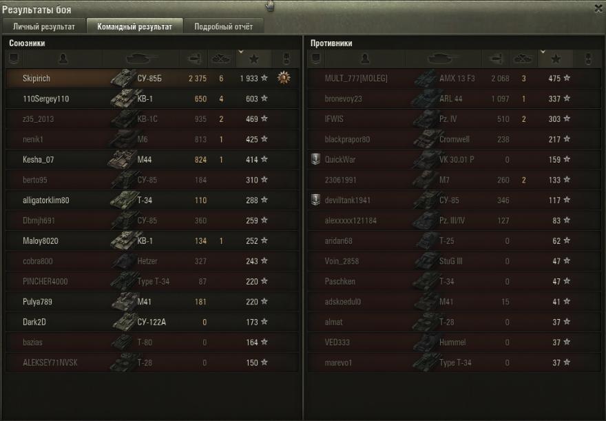Гыы, с низу списка вывез неплохой эконостас, правда весь бой лагало сильно, только и ждал что б уж поскорее грохнули, что бы другой сервак выбрать, а оно вон как получилось, ну видать противники такие попались)) http://wotreplays.ru...kipirich-su-85b