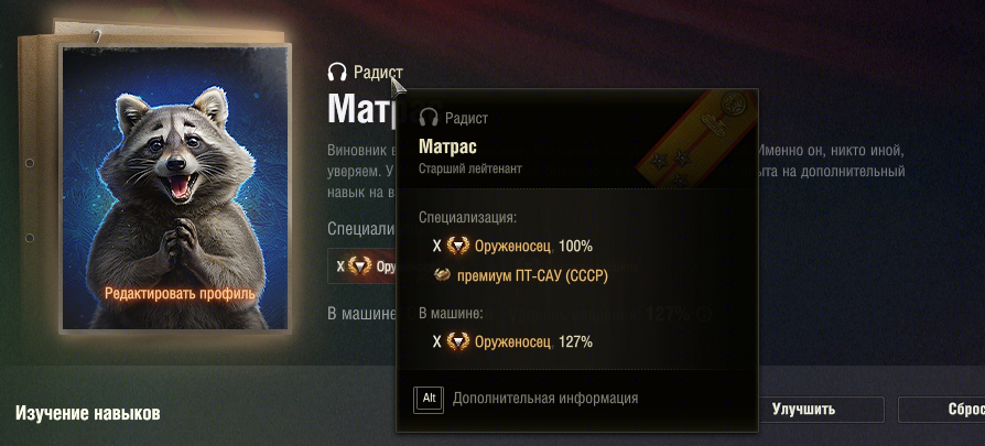 Видимо, дизайнера интерфейса давно уволили, ведь иначе бы такого издевательства над глазами игроков не было.1. Свёрнутая панель экипажа занимает на левой половине экрана гораздо меньше пикселей, чем эта делает панель ТТХ танка, что визуально утяжеляет правую сторону экрана информацией, из-за чего на фулл интерфейс неприятно смотреть. Ну и свёрнутая панель экипажа заставляет нас тратить секунды, которые на дистанции будут давать уже минуты и часы, чтобы просто проанализировать информацию о перках, – это не юзер-френдли (о чём уже все высказались в той или иной форме). Разницу можете оценить сами. (Рис. 1-3)2. В свёрнутом положении у члена экипажа пропадают другие специализации, кроме основной. Я понимаю, что, чтобы свернуть панель, надо ими пожертвовать. Но потом возникают смешные казусы, что командир качает перк "Бесконтактная боеукладка". Ещё хуже будет, если "потерянные" специальности будут вводить в заблуждение новичков или плохо разбирающихся в игре игроков (по типу: контузили командира и разброс увеличился – игрок недоумевает почему, ведь командир – не наводчик).3. Наложение количества перков на иконки уникальных членов экипажа – за такое надо выговор делать и лишать премии. Кто в здравом уме будет слой текста на слой с красивой иконкой лица ставить? Текст либо закрывает часть портрета члена экипажа, либо вовсе сливается. Подскажите-ка, а сколько там у меня перков у Вали-Ка, а то я старый стал, и зрение меня подводит. (Рис. 4)4. Кнопка "Редактировать профиль" абсолютно неуместно находится на документах. Да так, что у уникальных членов экипажа она перекрывает часть их фотокарточки. Так сложно было её справа от специализации добавить? (Рис. 5-6)5. Моя личная боль. Она появилась не в этом патче, но раз пишу про дизайн экипажа, то тоже добавлю. Почему были убраны из интерфейса армейские звания у членов экипажа? Теперь, чтобы узнать звание, нужно специально наводить на члена экипажа на танке или в казарме. (Рис 7-8) Каждый экипаж – это семья/друзья, с которыми мы отыграли много боёв. А теперь мы не только регалий воинских их не видим, а ещё при принудительно навязанном сворачивании у нас и имя их закрывают.Надеюсь, моё и десятки-сотни сообщений от других игроков хоть как-то повлияют на то, что дизайн интерфейса должен быть юзер-френдли и что не надо ломать то, что уже работает нормально, удобно и привычно. https://forum-mt-prod.lesta.ru/monthly_07_2025/post-1201686-0-81363200-1753399734_thumb.pnghttps://forum-mt-prod.lesta.ru/monthly_07_2025/post-1201686-0-95021300-1753399752_thumb.png https://forum-mt-prod.lesta.ru/monthly_07_2025/post-1201686-0-78252700-1753399764_thumb.png https://forum-mt-prod.lesta.ru/monthly_07_2025/post-1201686-0-20169000-1753399782_thumb.pnghttps://forum-mt-prod.lesta.ru/monthly_07_2025/post-1201686-0-40761200-1753399793_thumb.pnghttps://forum-mt-prod.lesta.ru/monthly_07_2025/post-1201686-0-48449800-1753399802_thumb.pnghttps://forum-mt-prod.lesta.ru/monthly_07_2025/post-1201686-0-27310800-1753399827_thumb.pnghttps://forum-mt-prod.lesta.ru/monthly_07_2025/post-1201686-0-03799300-1753399834_thumb.png