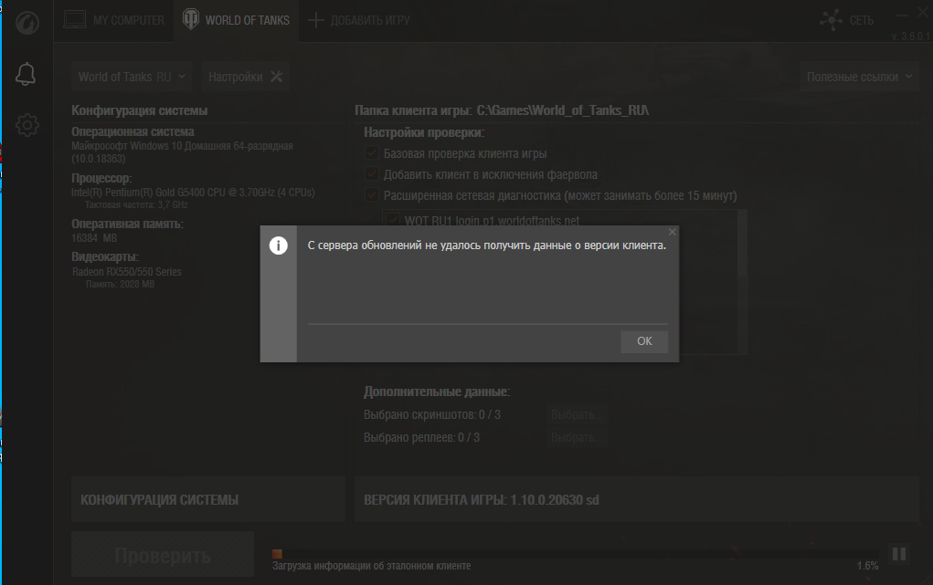 Здравствуйте форумчане, с последним обновлением, как я заметил, появилась проблема. Танк в бою уничтожен выхожу в ангар, а там все танки без гусениц.http://cdn-frm-eu.wargaming.net/wot/ru/uploads/monthly_08_2020/post-12063820-0-41943800-1598684384_thumb.jpg Беру другой танк выхожу в бой. Клиент виснет, приходится через диспетчер задач закрывать танки. Чистил кэш браузера игры и кэш клиента. Проверял WGcheck . При первой проверке, сервера не проверял. Вот что выдалоhttp://cdn-frm-eu.wargaming.net/wot/ru/uploads/monthly_08_2020/post-12063820-0-25513300-1598684703_thumb.png Далее проверил с серверами. 1) проверка http://cdn-frm-eu.wargaming.net/wot/ru/uploads/monthly_08_2020/post-12063820-0-98580200-1598684782_thumb.png Сам файл WGcheck http://cdn-frm-eu.wargaming.net/4.5/style_extra/mime_types/script.gif WoT_report.wgc 922,79К Из модов давно устанавливал ВГрадио . Папки с модами все удалил, кроме текущей версии. Играть невозможно через бой такая чепуха. Интернет Ростелеком и подсоединён к компу кабелем. Прогресс охоты на ЛИса и магазин не прогружаются. Что делать , куда копать?? WoT_report.wgc