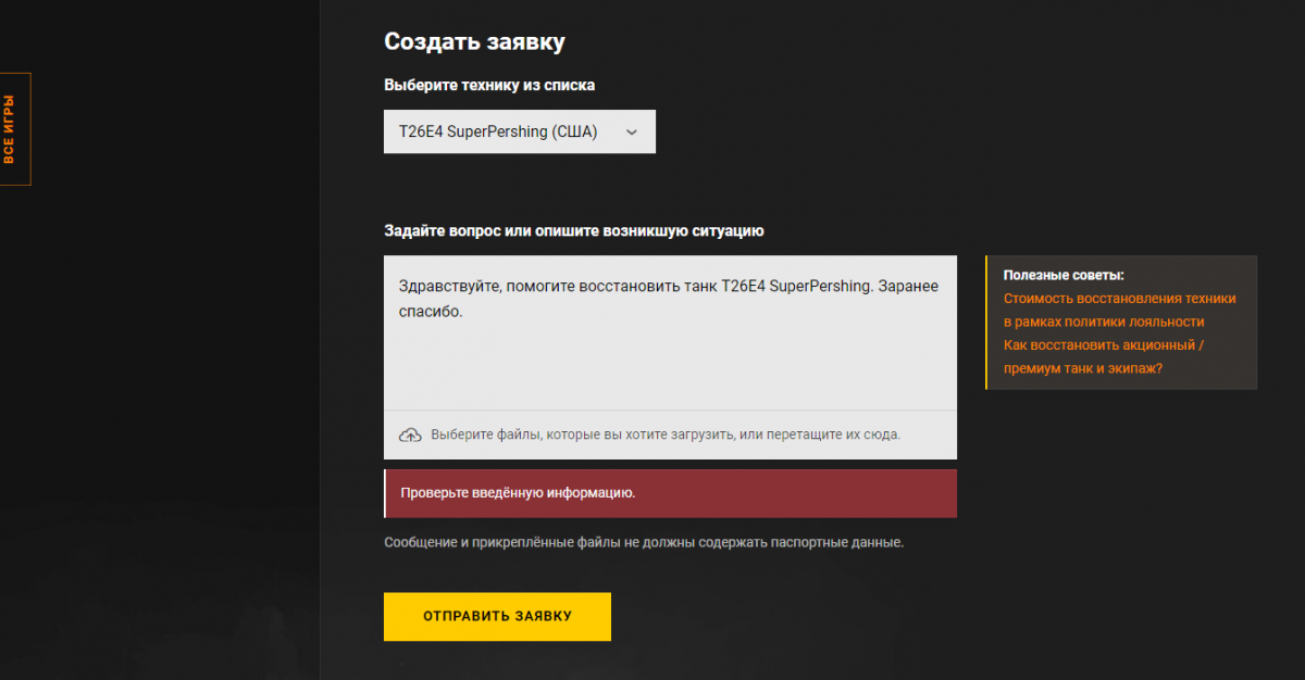 1. http://cdn-frm-eu.wargaming.net/4.5/style_images/wg/snapback.pngfreethinker (05 ноя 2019 - 11:52) писал: Попробуйте создать заявку в другой категории раздела, например "Игровое имущество" -> "Пропало игровое имущество". Вашу заявку в любом случае перенаправят в нужный раздел и рассмотрят. Та же самая проблема "Что-то пошло не так". При этом с другого аккаунта заявки прекрасно создаются.