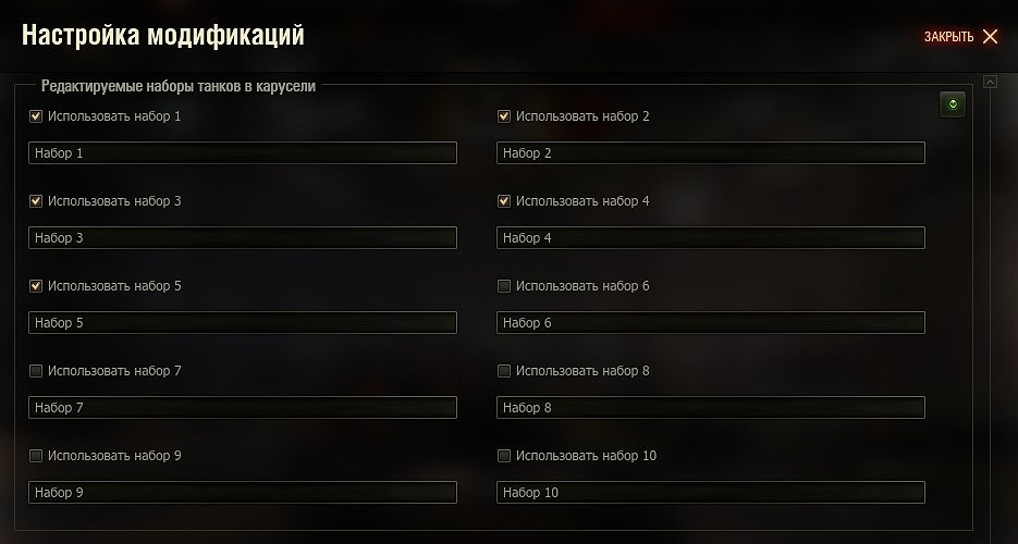 Добавляет возможность создать свои наборы танков (кроме cтандартных наборов [основной] и [резерв]). В фильтре видны как циферки (1, 2, 3, 4, ...), чтобы минимально искажать интерфейс. Список версий - https://github.com/o...k_sets/releases Последний релиз для 1.41.0.0 - архив https://github.com/ol-loginov/mt_tank_sets/releases/download/v1.41.0.0/com.github.ol_loginov.mt_tank_sets-1.41.0.0.zip Исходники находятся тут: https://github.com/o...ov/mt_tank_sets Место для вопросов и ответов - тут (или на гитхабе: https://github.com/o...ank_sets/issues) Проверил с последней версией XVM - работает. Но если у кого-то будут проблемы - пишите, будем решать. Установка: * В архиве лежат три файла mtmod, которые надо разархивировать в папку "<Мир танков>/mods/1.41.0.0/" Скриншоты: * Добавление/удаление через контекстное меню на танке https://forum-mt-prod.lesta.ru/monthly_07_2025/post-122124450-0-34063700-1752060313_thumb.jpg * Выбор наборов в фильтре карусели (добавлены как числа 1,2,3,4,5,...) https://forum-mt-prod.lesta.ru/monthly_07_2025/post-122124450-0-35348800-1752060307_thumb.jpg * Настройки мода в правом нижнем углу ангара https://forum-mt-prod.lesta.ru/monthly_07_2025/post-122124450-0-98785100-1752060318_thumb.jpg Скринкаст: Видео использования (без звука и субтитров) https://rutube.ru/vi...b7c570c0c3413a/