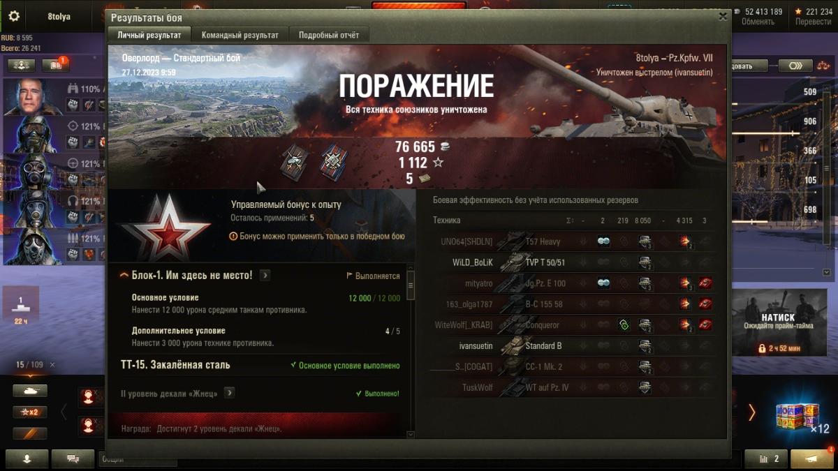 Спасибо огромное за приятный сюрприз! Сегодня зашел в игру и тут выскочило окошко с поздравлением годовщины создания аккаунта, много всего приятного, задачи на 500 золота особенно, правда до 1 декабря надо выполнить, но надеюсь успею Вообще хотелось бы рассказать что в этом году запомнилось особенно: наконец-то получил звания "Старший Инженер-механик", "Эксперт", потом как-то получилось много задач Долгожданного Подкрепления и Второго Фронта выполнить, вообще Т55А никак выиграть не могу много лет, оставалось 7 задач, в этом году стал все пытаться выполнить, думал может дело сдвинется, выполнил с "отличием" сотню задач, вот теперь 2 осталось еще невыполненных. И Химеру еще 19 задач осталось чтобы выиграть. Еще 1000 золота в подарок пришло в этом году, уж не помню за какую акцию, да много еще золота выиграл - долго рассказывать, но за все спасибо! И за все танки какие выиграть получилось тоже спасибо! И за игру спасибо, за все хорошее что в ней есть!