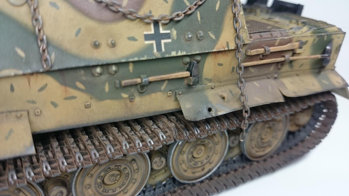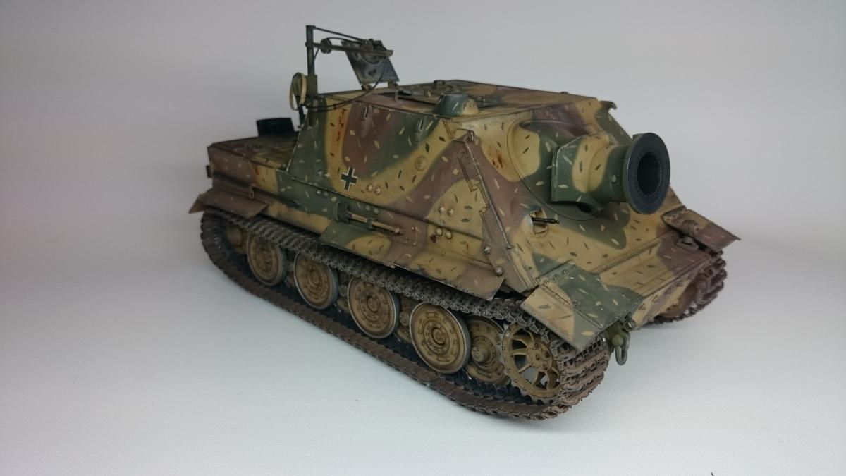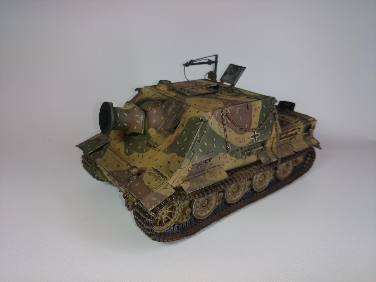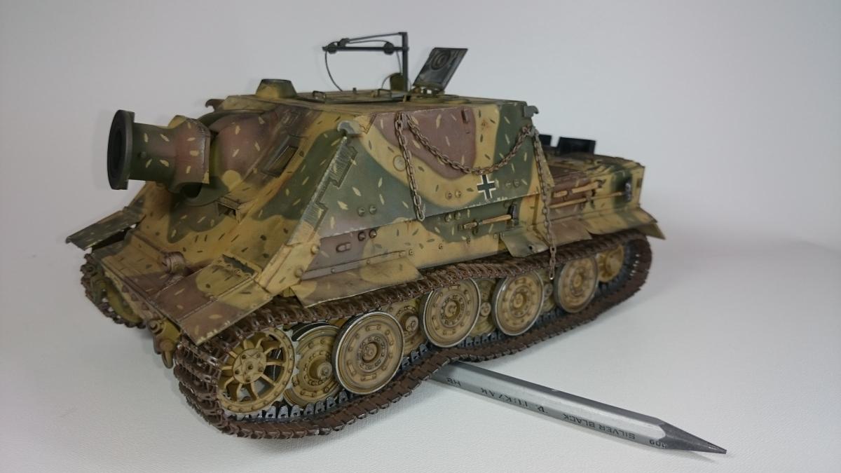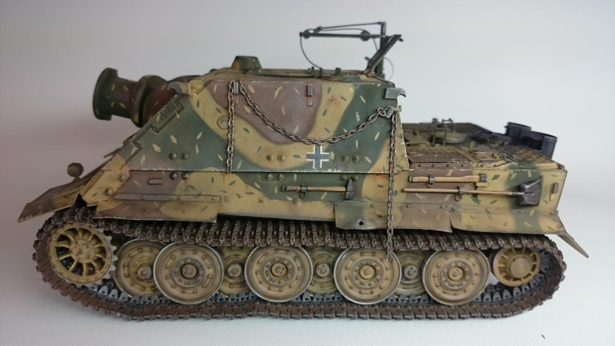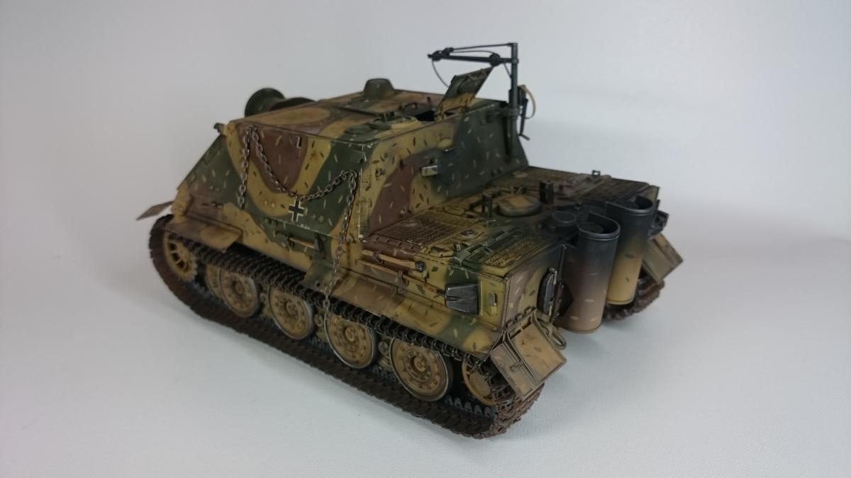 Доброго дня, уважаемые форумчане! Лет так 10 назад попались мне в инете картинки с данной установкой, сначала я думал, что это очередной чудо прожект третьего рейха утопического характера, мол ну как это орудие 380мм, у нас бр-5 и то 280мм, а эта еще и на гусиничном ходу!!!!. Но оказалось, что данные "монстры" реально были и воевали, к примеру в Польше в 1944 году. Даже на модельной полке данный агрегат смотрится как то пугающе, да он меньше Е-100, но его гипертрофированное орудие просто гипнотизирует, как... как.... оно туда поместилось. P/s при изготовлении данной модели учел замечании товарищей про свежий шансовый инструмент на пантере.