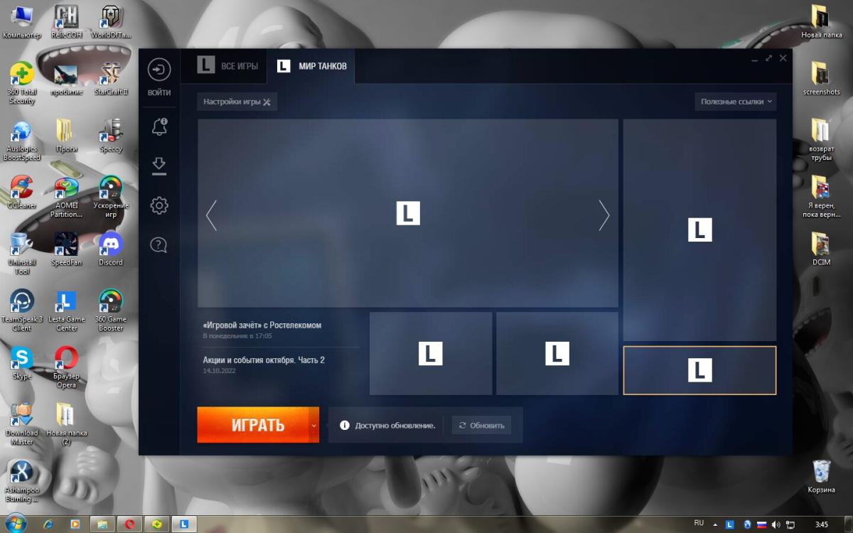 Думаю, попробую грохнуть антивирус и заново загрузить игру без него. ( а то что-то бывало антивируник при загрузке игры чутка ругался). А так, есть какие предложения по исправлению, и приведению в порядок Винды??? Или фатальная переустановка Винды?? Может обновы какие скачать или что-нить? Я тоже предполагаю, что тут что-то, не знаю что, не пропускает полный объём информации, стопорит, блокирует часть. Гуглил свою проблему, но получается эта проблема только у меня. Нигде нет даже намёка на исчезнувшие разделы. ( но факт, на сайте Варгейминга все разделы на месте, в Лесте нет) Да и ещё плюс к этому в Леста центре новости не прогружаются и постоянно появляется обновление, хотя обновлять нечего. Но при открытии центра появляется обнова всегда...Скрин высылаю также. #7