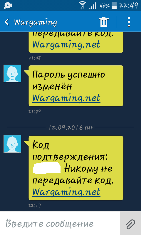 Доброго времени суток. Пару дней назад сын играя в танки увидел что мой аккаунт находится в игре о чём и сообщил мне сменив пароль в связи с отсутствием свободного времени зайти и отписаться было некогда просто сменив пароль дожидаясь когда появится время обнаружил ещё раз проблему кто то попытался сменить пароль ещё раз так как аккаунт привязан к моему телефону смс ка пришла именно на него зайдя сегодня в игру после долгого перерыва обнаружил что проданы танки из класса премиум су122-44,Вз-111,Т26Е4, как разрешить вопрос и наказать виновника и вернуть всю технику на место ? да и ещё были удалены все друзья из списка и в данный момент набраны новые в тоже время заполнен чёрный список из довольно таки из не малого количества граждан которого не было ! Вычислить виновника можно по айпи адресу я так понимаю можно и для сотрудников не должно составить труда что бы это сделать !скрин-шот сообщения о попытки повторного смене пороля приложу. http://cdn-frm-eu.wargaming.net/wot/ru/uploads/monthly_09_2016/post-12654988-0-17960100-1473789863_thumb.png