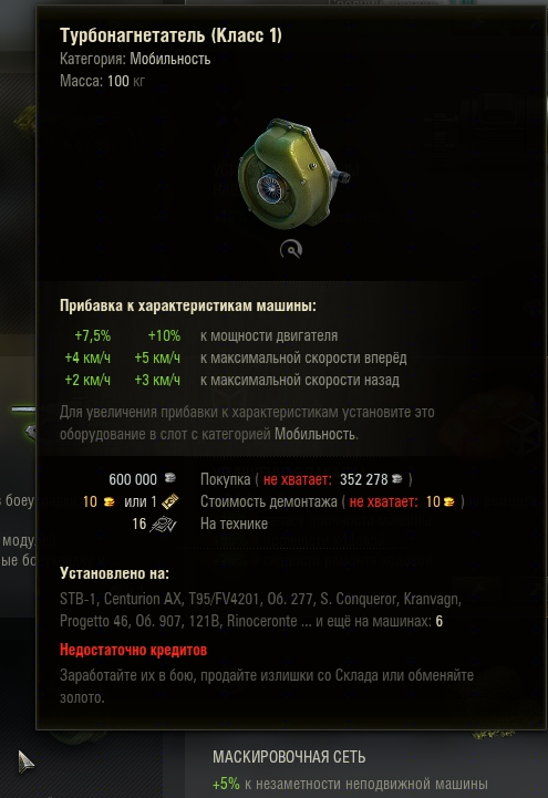В поисках модулей... На технике столько-то... и в конце И ЕЩЁ на 500 МАШИНАХ стоит турбинка. НА КАКИХ ЕЩЁ МАШИНАХ??? У меня 150 танков в ангаре, где я буду искать ОСТАЛЬНЫЕ ТУРБИНЫ??? Предложение либо отображать полный список техгники, на которых стоит модуль (например по нажатию Alt), либо перенести этот список туда, где он ПОЛНОСТЬЮ отобразится