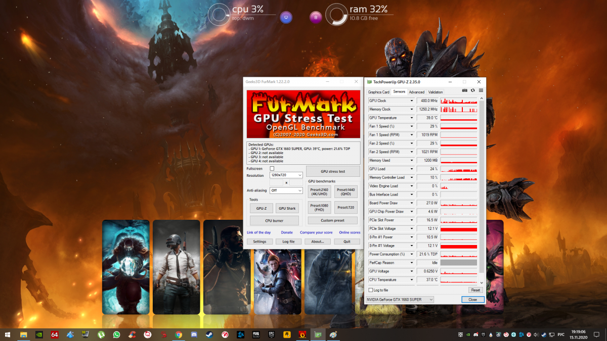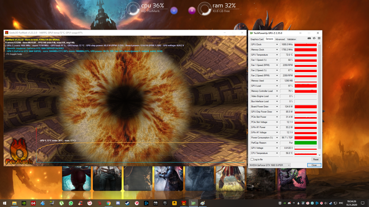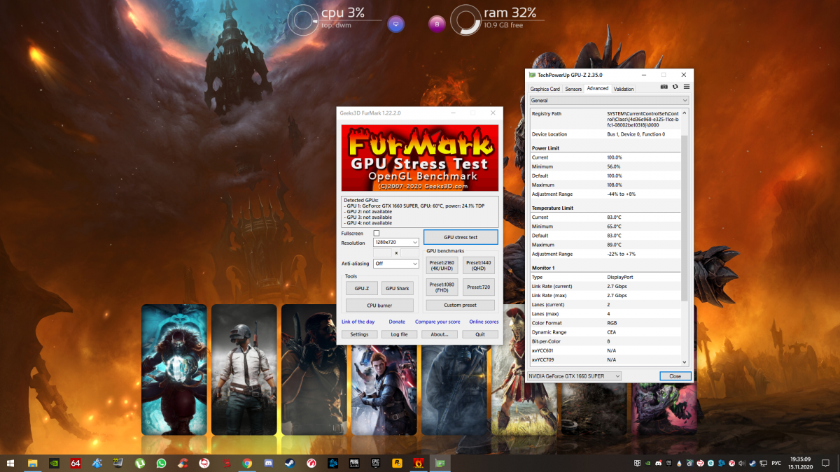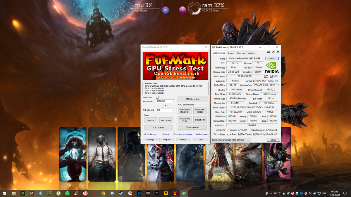 Доброго времени суток! Столкнулся с проблемой, что периодически во время боя появляются черные текстуры. Бывает длятся весь бой, бывает пропадают через несколько секунд. Также время от времени зависает клиент и не отвисает. Приходится на втором рабочем столе открывать диспетчер задач и закрывать игру. Модов не устанавливал. Раньше играл, все нормально было. Не играл примерно полгода, тут решил снова начать и встретился с этой проблемой. Сносил полностью клиент, ставил по новой, скачивал с форума bat-файлы из похожих тем, драйвера на видеокарту обновлены. Железо вроде неплохое: i5-9400F, 16 Гб, GTX 1660 Super. В других играх никаких проблем нет. Проводил стресс-тест видеокарты в программе FurMark, запускал на 15 минут. Ни фризов, ни каких намёков на неисправность нет. Видеокарта не греется выше 72 градусов. Скрины текстур в игре и теста в приложении. WoT_report.wgc