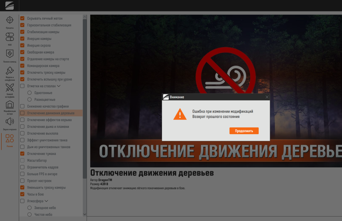 Блокируется установка модов из-за следующих выбранных модификаций - Шкурки Эстета, Танковый Эксперт Dragon'a. Помимо этого когда жмешь "Продолжить" после этого, то все выбранные модификации сбрасываются, и снова приходится выбирать по новому кругу.