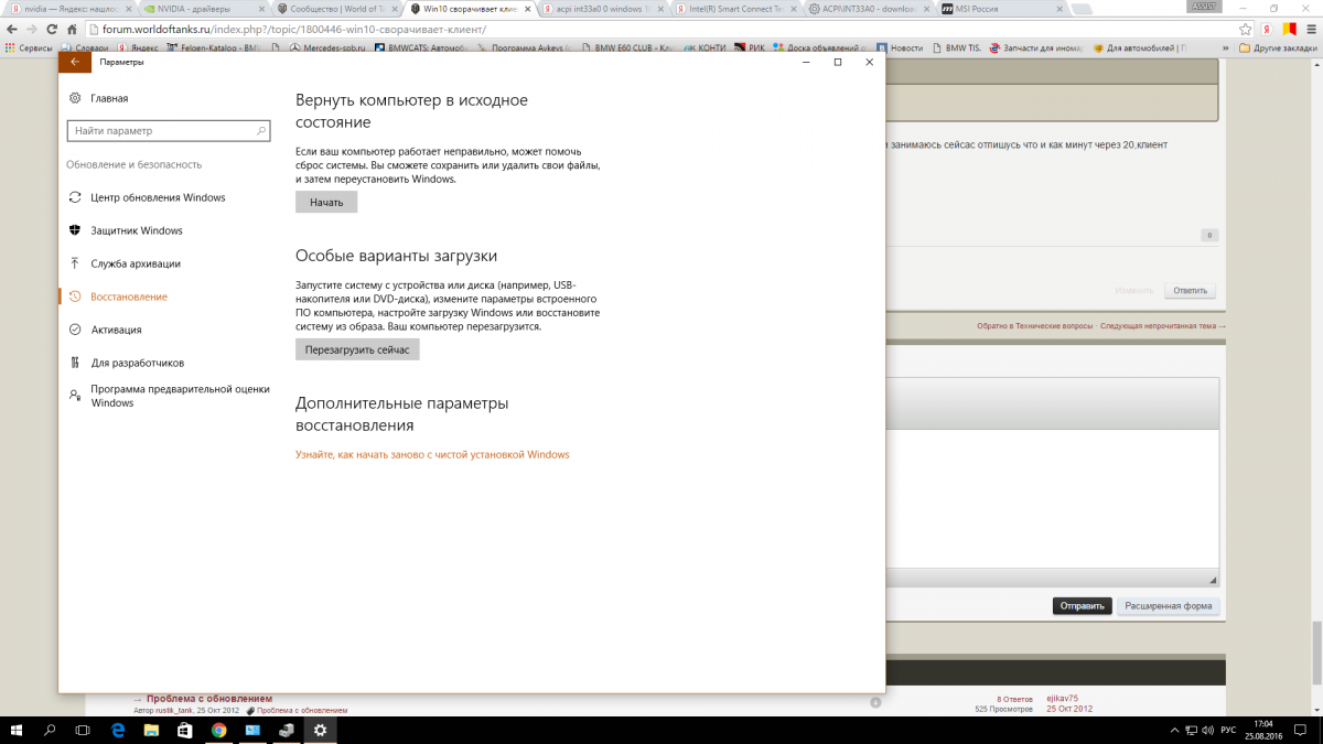 Все,наконец то я ее победил.Рассказываю как сделать:Вин 10-64 Заходим в Параметры,пуск- звездочка-обновление и безопасность(жмем),в левом столбике параметр восстановление(жмем),в самом низу будет пункт(Дополнительные параметры восстановления,ниже ссылка(тыкаем на нее)Узнайте,как начать заного с чистой установки Windows///откроется вот эта ссыль https://www.microsoft.com/ru-ru/software-download/windows10startfresh мотаем вниз до пункта,Скачать средство сейчас,нажимаем сохранить,запускаем,прога на англ. не сложная,специально видимо для людей где что то после обновы не работает в WIN10.Далее прога запуститься и предложит 2-3 варианта загрузки,стирания и тд,выберите нужный диск-параметр,я удалил все на всех дисках,винду она просто переустанавливает и убирает все лишнее,т.е все настройки кроме сети удалятся,в раб столе начнется загрузка,можно использовать комп пока она не напишет,что типо несколько раз перезагр. и все,установка и чистка заняла минут 15-20,затем скачивайте клиент устанавл и вуаля,все работает,не будем сейчас копать что там было понаставлено у майкрасофта но самое главное все работает,дрова на видео не забудьте установить заного