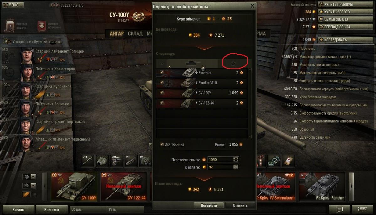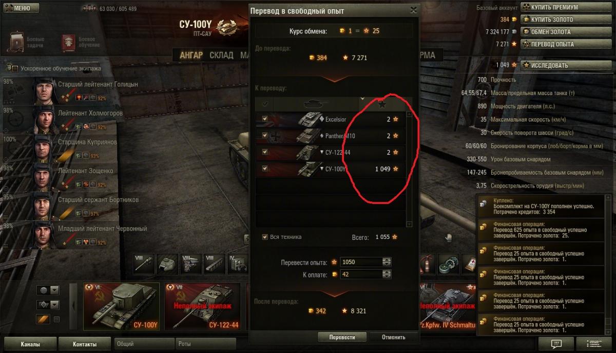 уууу дорогой мой, ты то мне мозг........ага? на картиночку (скрин шот) на вторую нажми и с права в логе посмотри, я по 25 опыта и перевожу, но мне нада (на скрине видно 4 танка у 3х по 2 опыта осталось, у другого 1049, так вот ниже написано что я могу перевести только 1050 (видно, не?! или синдром школьника) так вооООТ 1049+2+2+2-1050=5 тоесть на су100y мне нада что бы осталось 5 опыта у меня же остается м10\пантера -2 опыта, су122-44 -2 опыта и су100у один опыткороче как сделать так чтоб он сначала переводил эти остатки, а потом срубал опыт там где больше и оставлял остаток на 1м танке а не на 5-7ми танках по 2-3 единицы опыта ппц разжевал как в детсаду =\
