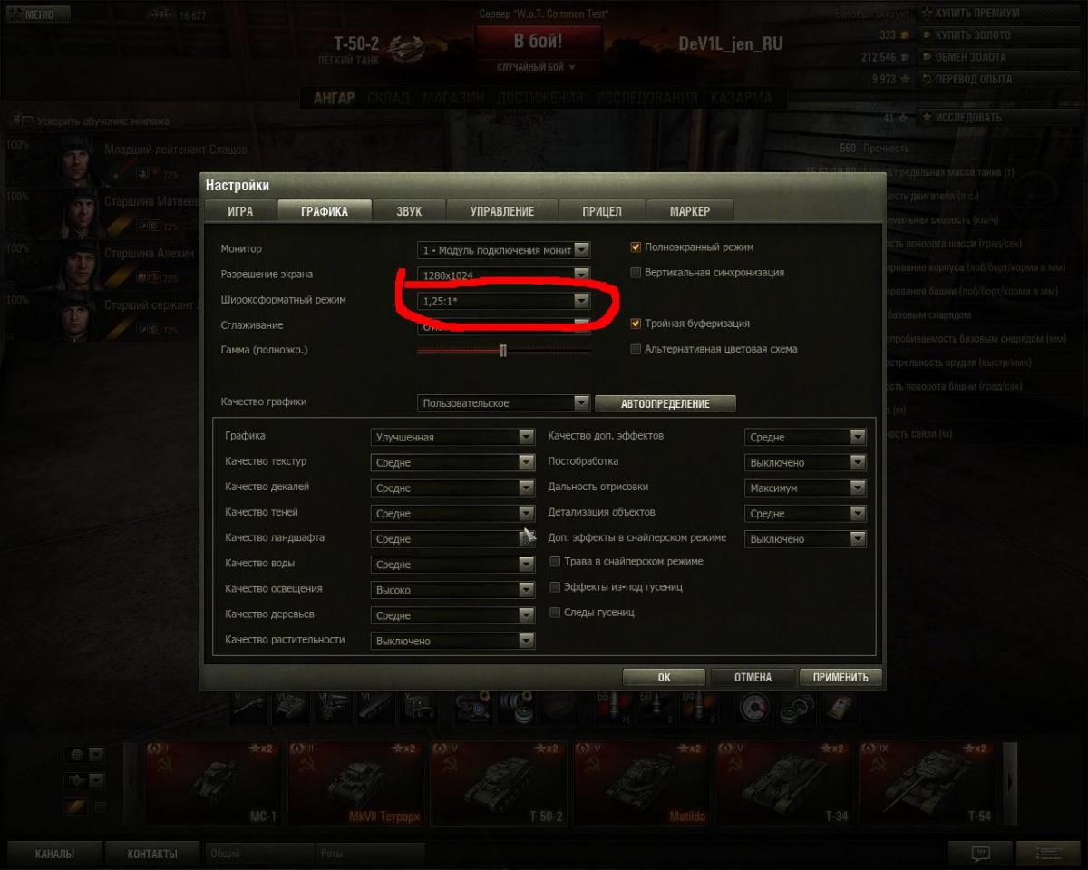 3. у меня такой вопрос : как мне поставить "широкоформатный режим" в настройках игры 1,25:1* ?? Он сейчас стоит у меня на тесте, и он больше мне нравится, но на основном клиенте я его не могу выбрать. Раньше он у меня был и там, но я как-то раз захотел похимичить с настройками и начал всё пробовать, вплоть до того, что танки были тонкие, как спички =). Потом бац - нет режима который был, и это не связано ни с какими модами, ни пропажей настроек в связи выхода обновления. Я пробовал скачивать новый клиент игры и переустанавливать в другую папку. Возможно, это связано с тем, что настройки игры сохранены на диске С? Если да, то как их вообще удалить?