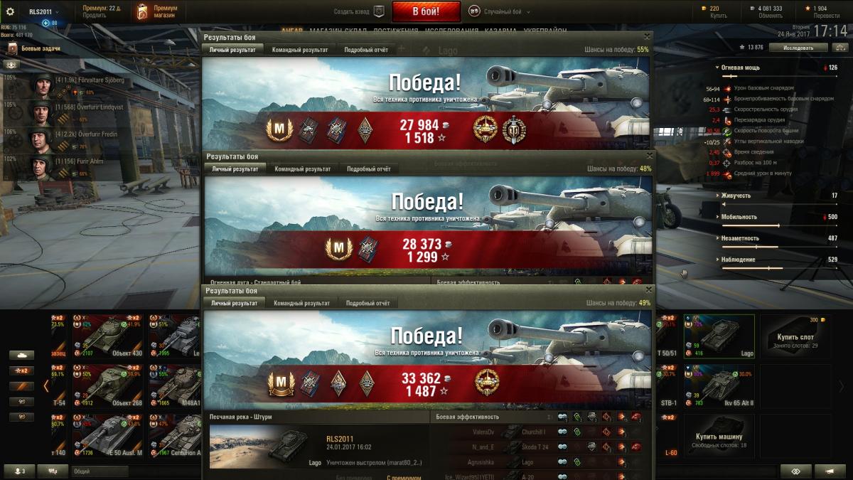 Итак, джентльмены, чуть менее двух месяцев катания на различных СТ, и никакого намека на выполнение СТ 15. Однако сегодня все пошло по другому) Бой первый - дрожащие руки, когда понял, что две ПТ я грохнул, куча ошибок вроде толкания, стрельбы в никуда, стрельбы по целям с десятком хп, когда нужен дамаг, долгое прицеливание по ИСу 3, когда нужно было бить сходу... Итог - задача выполнена, но без отличия. А надо с отличием, т.к. арта не входит в мои планы) Хоть мастера взял, и отметку на ствол... http://wotreplays.ru/site/6584523#lasvill-rls2011-vk_30_01_p Буквально через пару боев на другой машине) Хладнокровие, и точный расчет дает совсем другой результат http://wotreplays.ru/site/6584532#lasvill-rls2011-t-34-1