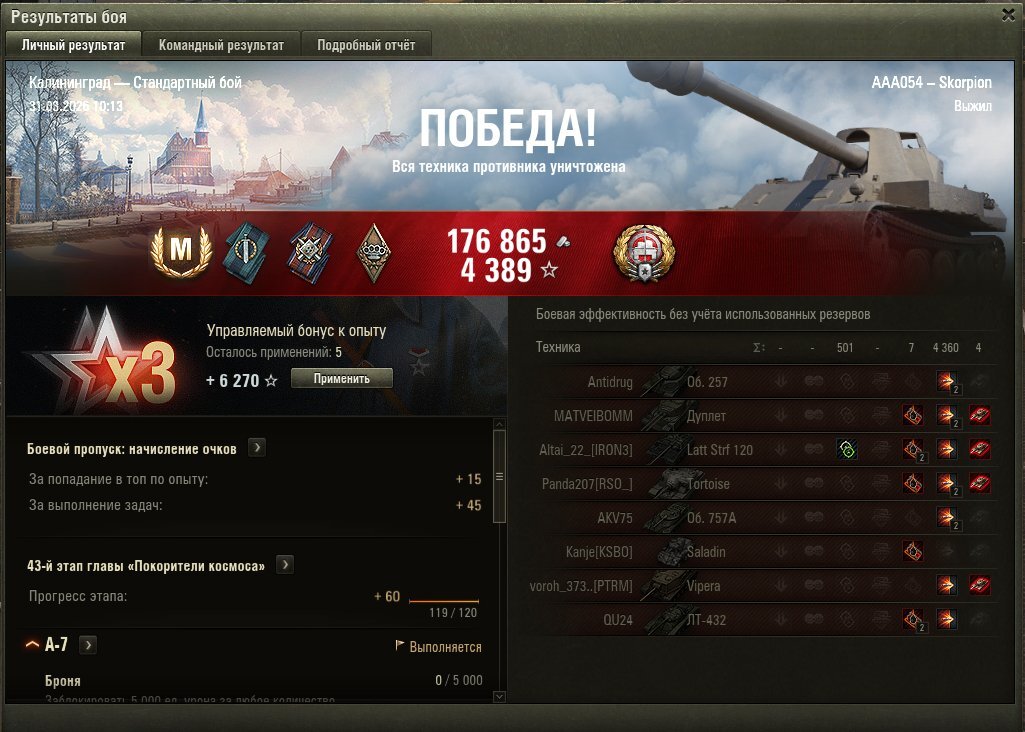 А к чему тут про средуху? Чтобы что? Чтобы перед неизвестными ноунеймами на форуме рисоваться? Так твои 3200 так то тоже такая себе зарисовка, ниочем... В чем он не прав? Что бабаха может на 2К выписать при установленной каморе? Да запросто. Что можно найти в игре какого-то 43% чемпиВона, который под бабаху два раза вылезет? Да в каждом бою. Смысл кого-то тут в средухе упрекать? Вот моя средуха за бой. Два фугаса, один в борт мбт-б, второй в зад т100. Затем Esc и выход в ангар, потому что тратить время на стаю дикобразов нет никакого смысла. Как и гнаться за средухой.