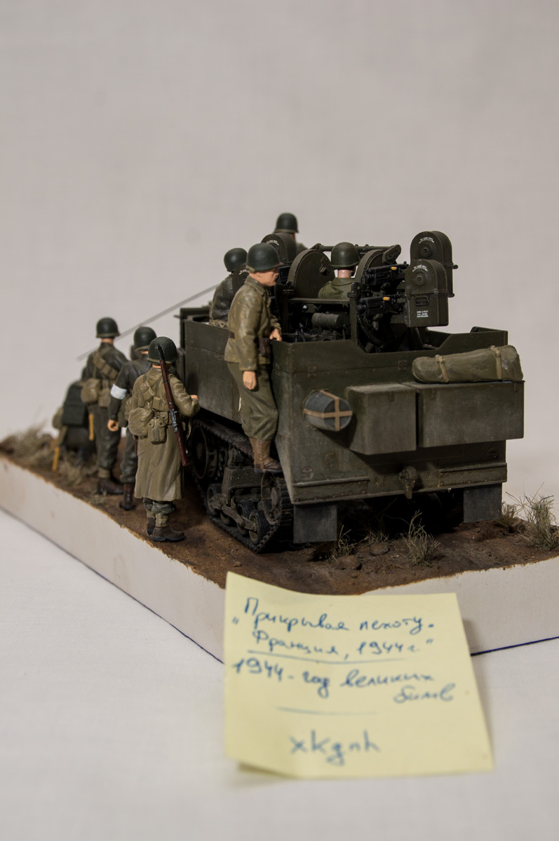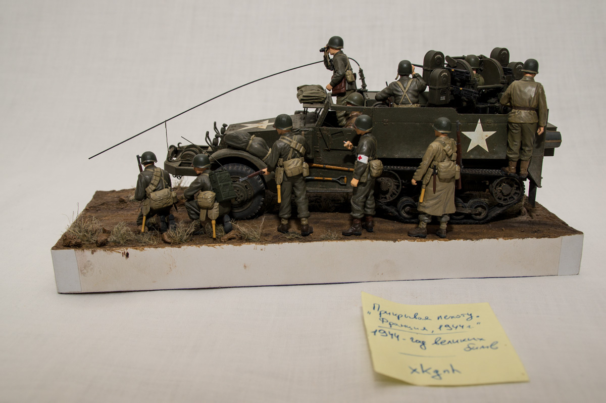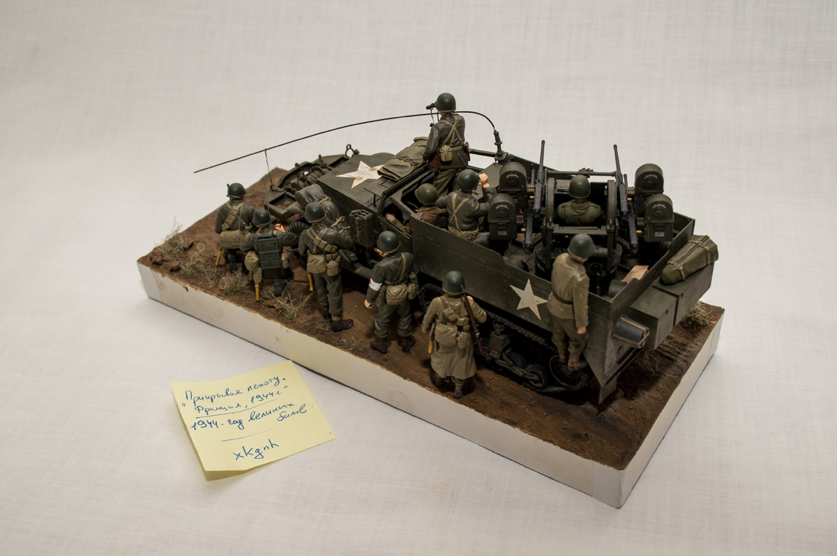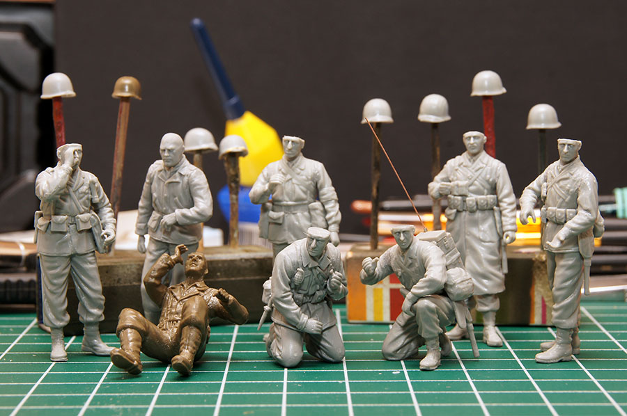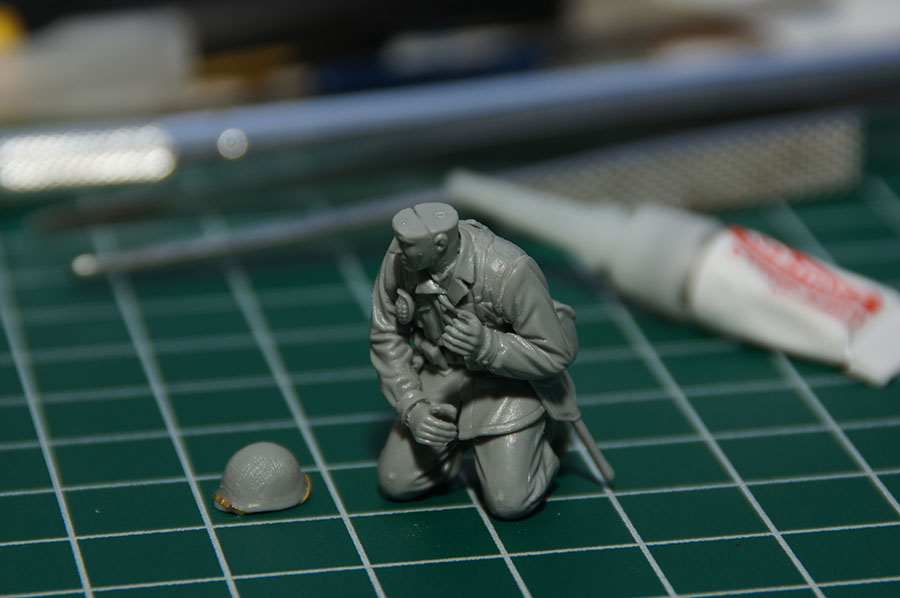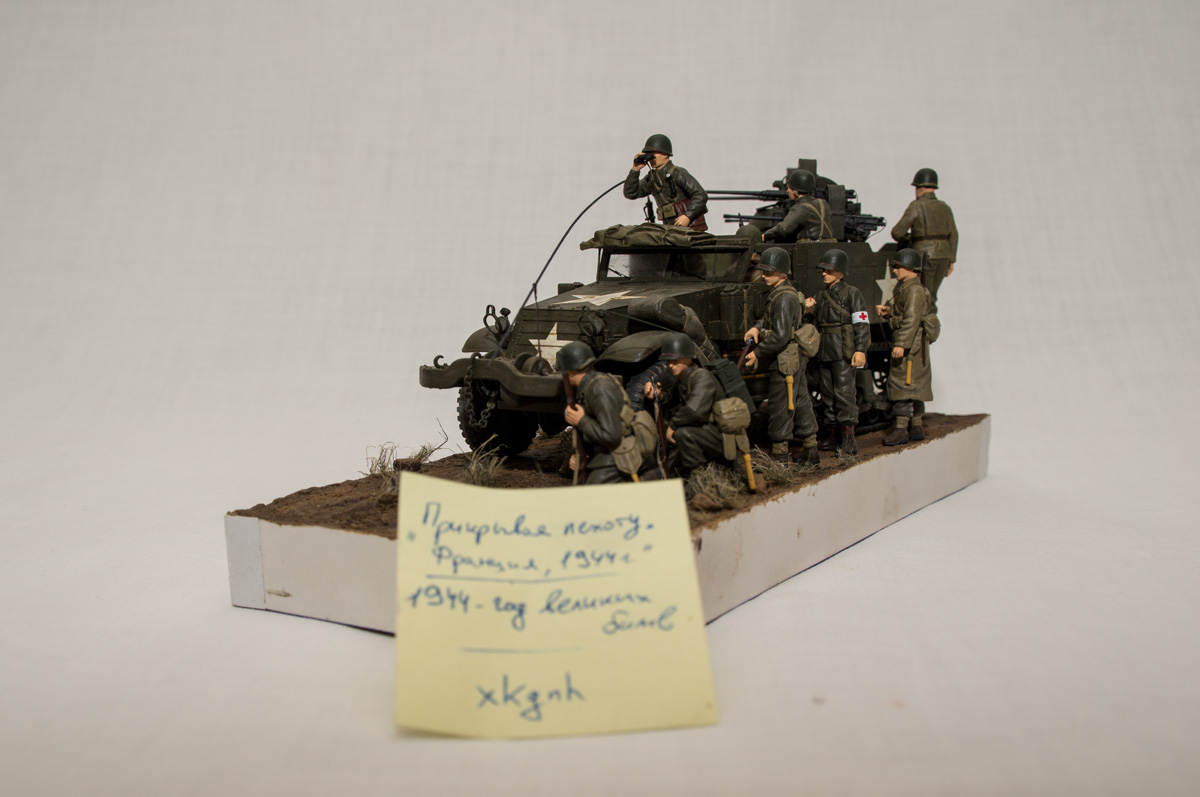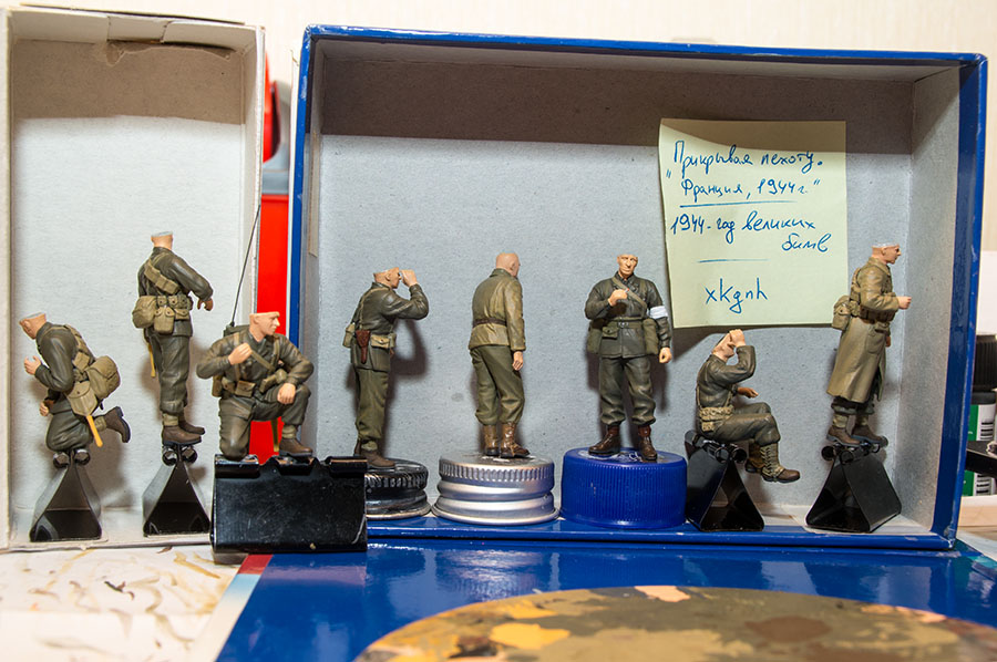 Следующие - заряжающие зенитной установки. Первый - из набора MIniArt. Минимум деталей. Качество норм. Без каски похож на Фантомаса http://cdn-frm-eu.wargaming.net/wot/ru/uploads/monthly_07_2014/post-11027791-0-58394900-1406616345_thumb.jpg http://cdn-frm-eu.wargaming.net/wot/ru/uploads/monthly_07_2014/post-11027791-0-15404500-1406616375_thumb.jpg http://cdn-frm-eu.wargaming.net/wot/ru/uploads/monthly_07_2014/post-11027791-0-50655700-1406616380_thumb.jpg Второй - из древнего набора Тамии под названием "Американская штурмовая группа на отдыхе" (хотя это полноценный набор с экипажем хаф-трака, кроме водилы). Деталировка еще скромнее. http://cdn-frm-eu.wargaming.net/wot/ru/uploads/monthly_07_2014/post-11027791-0-07833900-1406616606_thumb.jpg http://cdn-frm-eu.wargaming.net/wot/ru/uploads/monthly_07_2014/post-11027791-0-05491600-1406616644_thumb.jpg У этого персонажа "одеты" подсумки для винтовки Гаранд, но экипажи ЗСУ не оснащались такой винтовкой. На 5-х у них были: один Томпсон (для командира), три Винчестера и одна винтовка Springfield M1903 (с наствольным гранатометом). Наверно для водителя, но точных данных у меня нет, поэтому предположим, что она у заряжающего) Изучая старые фото, определил, что, в принципе, подсумки у Гаранда и Спрингфилда можно считать одинаковыми, так что оставил все как есть. http://cdn-frm-eu.wargaming.net/wot/ru/uploads/monthly_07_2014/post-11027791-0-18101600-1406616811_thumb.jpg http://cdn-frm-eu.wargaming.net/wot/ru/uploads/monthly_07_2014/post-11027791-0-44984400-1406616926_thumb.jpg Далее, командир ЗСУ. Собран из двух "человек" из набора Драгона: собственно командира (верх) и рядового (низ), т.к. по замыслу он стоит в машине и наблюдает в бинокль за обстановкой. Расчлененку забыл сфоткать, но деталировка там неплохая. http://cdn-frm-eu.wargaming.net/wot/ru/uploads/monthly_07_2014/post-11027791-0-13986400-1406616910_thumb.jpg И последний "участник боя" - пехотинец, выглядывающий из-за бронемашины. Он из набора Драгона "Танковый десант" второго поколения (Gen2). Качество и деталировка совершенно другого уровня, есть фототравление, даже погоны даны отдельными деталями. Обработки потребовалось минимум. http://cdn-frm-eu.wargaming.net/wot/ru/uploads/monthly_07_2014/post-11027791-0-83950800-1406617112_thumb.jpg http://cdn-frm-eu.wargaming.net/wot/ru/uploads/monthly_07_2014/post-11027791-0-64683600-1406617068_thumb.jpg http://cdn-frm-eu.wargaming.net/wot/ru/uploads/monthly_07_2014/post-11027791-0-20167100-1406617075_thumb.jpg http://cdn-frm-eu.wargaming.net/wot/ru/uploads/monthly_07_2014/post-11027791-0-19594400-1406617082_thumb.jpg Вся гвардия в сборе, хорошо заметна разница в качестве литья: http://cdn-frm-eu.wargaming.net/wot/ru/uploads/monthly_07_2014/post-11027791-0-68186600-1406617766_thumb.jpg Примеряю фигуры на диораме: http://cdn-frm-eu.wargaming.net/wot/ru/uploads/monthly_07_2014/post-11027791-0-10199400-1406617783_thumb.jpg Далее грунтовка, контроль дефектов и буду окрашивать, наконец)