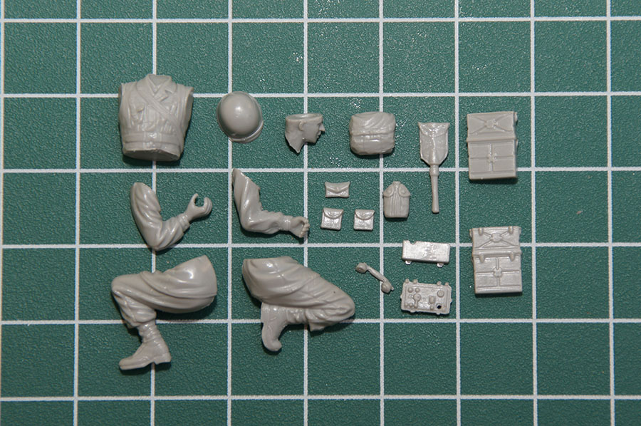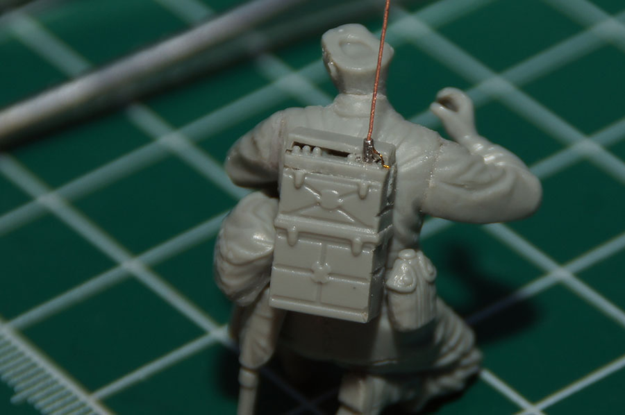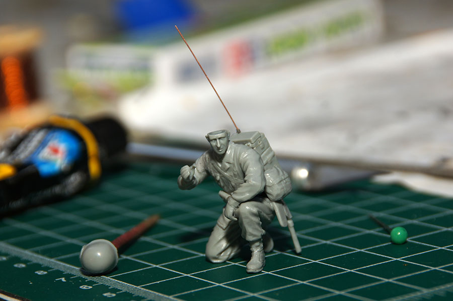 Следующий в очереди - радист. Из того же Драгоновского набора, такой же замыленный и с дефектами. http://cdn-frm-eu.wargaming.net/wot/ru/uploads/monthly_07_2014/post-11027791-0-38916300-1406613887_thumb.jpg В наборе предполагается, что он держит в руке трубку и разговаривает, по моему замыслу это не требуется, поэтому подпиливаю руку - в ней он будет держать свой карабин. Другую руку он "положил" на колено. Исправляю дефекты, обтачиваю, шкурю, шпаклюю... Теперь рация. В наборе идет пехотная радиостанция SCR-300 с приёмо-передающим устройством ВС-1000. http://cdn-frm-eu.wargaming.net/wot/ru/uploads/monthly_07_2014/post-11027791-0-42726700-1406614275_thumb.jpg http://cdn-frm-eu.wargaming.net/wot/ru/uploads/monthly_07_2014/post-11027791-0-41720700-1406614319_thumb.jpg http://cdn-frm-eu.wargaming.net/wot/ru/uploads/monthly_07_2014/post-11027791-0-95816000-1406614348_thumb.jpg Выполнена несколько грубовато и тоже замылена. Но особо заморачиваться не стал. Из обрезка иглы сделал бакелитовую втулку, из проволоки 0,2 мм - антенну, из проволоки 0,1 мм хорошо видимый проводок заземления антенны. http://cdn-frm-eu.wargaming.net/wot/ru/uploads/monthly_07_2014/post-11027791-0-72874300-1406615033_thumb.jpg В итоге рация: http://cdn-frm-eu.wargaming.net/wot/ru/uploads/monthly_07_2014/post-11027791-0-89120600-1406615085_thumb.jpg Честно говоря, не хотелось ковыряться с протаскиванием проводов, поэтому по замыслу трубка и "гарнитура" со всеми проводами убрана в специальную сумку, в рацию установлена "короткая" антенна AN-130-A, а "длинная" AN-131-A убрана в ту же сумку. Самой этой сумки BG-150-A в наборе нет, ее пришлось делать с нуля, обтачивая кусочки литников и прорезая швы скрайбером, благо она несложно выглядит - три отделения (для турбки, проводов и антенн): http://cdn-frm-eu.wargaming.net/wot/ru/uploads/monthly_07_2014/post-11027791-0-41363500-1406614688_thumb.jpg http://cdn-frm-eu.wargaming.net/wot/ru/uploads/monthly_07_2014/post-11027791-0-32313800-1406615243_thumb.jpg Более того, сверху я ее прикрыл обычной сумкой, так что видными остались только часть отделения для трубки и длинный конец отделения для антенн. Итак, радист: http://cdn-frm-eu.wargaming.net/wot/ru/uploads/monthly_07_2014/post-11027791-0-64260500-1406615197_thumb.jpg