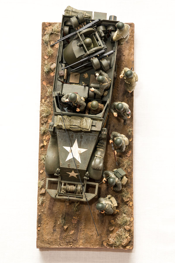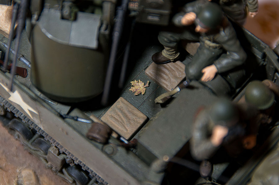 Пару слов о том, как завершал диораму. Докрасил оставшихся персонажей: http://cdn-frm-eu.wargaming.net/wot/ru/uploads/monthly_08_2014/post-11027791-0-47329300-1408529652_thumb.jpg По идее, медику надо было нанести красные кресты на шлем с 4-х сторон, но декали оказались такие толстые и дубовые, что отказались ложиться на место даже после применения всех спецжидкостей. Рисовать их вручную было некогда, да и влом уже, поэтому оставил обычный шлем, такие фотки тоже встречались: http://cdn-frm-eu.wargaming.net/wot/ru/uploads/monthly_08_2014/post-11027791-0-93320700-1408530082_thumb.jpg Раздал всем оружие и рассадил по своим местам: http://cdn-frm-eu.wargaming.net/wot/ru/uploads/monthly_08_2014/post-11027791-0-86218600-1408529787_thumb.jpg В принципе, почти все задуманное было сделано. Но пока фоткал модель и грузил фотки, прием заявок на конкурс успел закончиться... Потом, в спокойной обстановке, покрасил основание и решил добавить еще сухих опавших листьев. Листья взял из набора Model Scene, ибо самому их вырезать или вырубать из бумаги - это адское и неблагодарное дело: http://cdn-frm-eu.wargaming.net/wot/ru/uploads/monthly_08_2014/post-11027791-0-65577600-1408530322_thumb.jpg В наборе кленовые листья какого-то особо кислотного цвета, а у дубовых слишком длинные черенки. Поэтому лишнее отрезал и все окрасил акрилом Valejo. Вот что вышло: http://cdn-frm-eu.wargaming.net/wot/ru/uploads/monthly_08_2014/post-11027791-0-11543500-1408530642_thumb.jpg http://cdn-frm-eu.wargaming.net/wot/ru/uploads/monthly_08_2014/post-11027791-0-39709100-1408530643_thumb.jpg Один листик закинул в кузов http://cdn-frm-eu.wargaming.net/wot/ru/uploads/monthly_08_2014/post-11027791-0-87470000-1408530644_thumb.jpg Вот и все, диорамка готова.