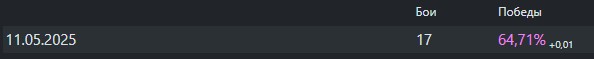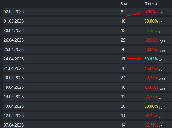 "Ну это нормально", честный баланс, равные команды сегодня. Сильно заметна подкрутка 58% за бои 24 апреля.