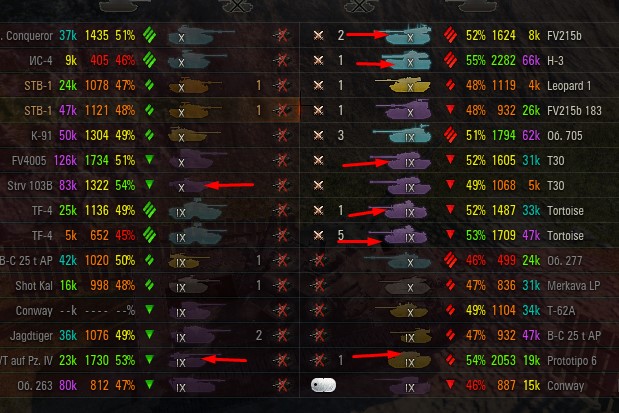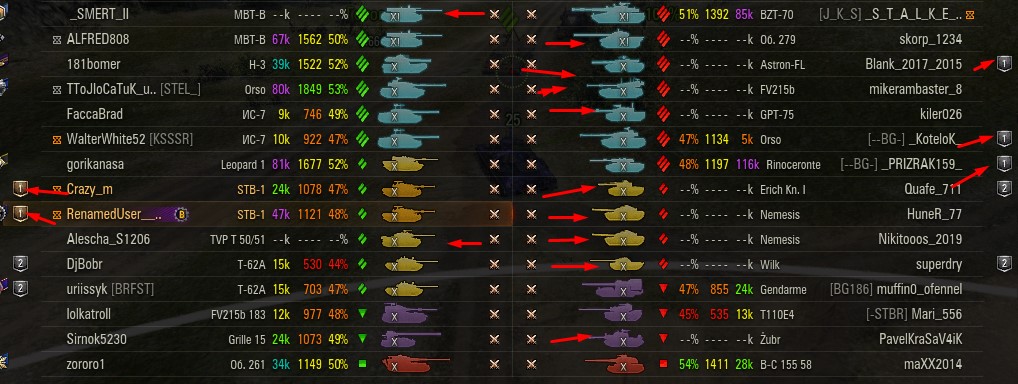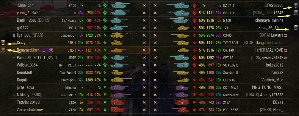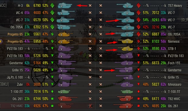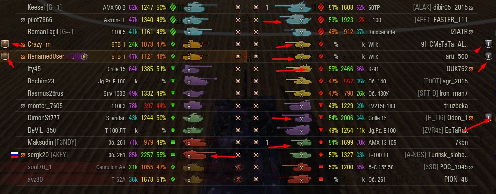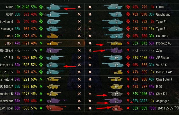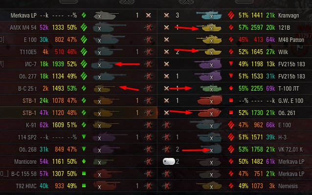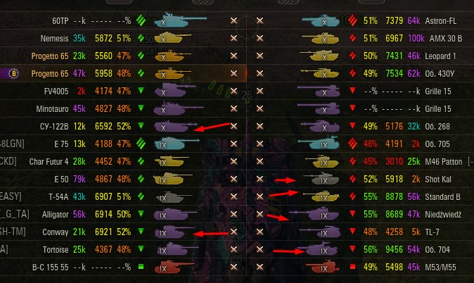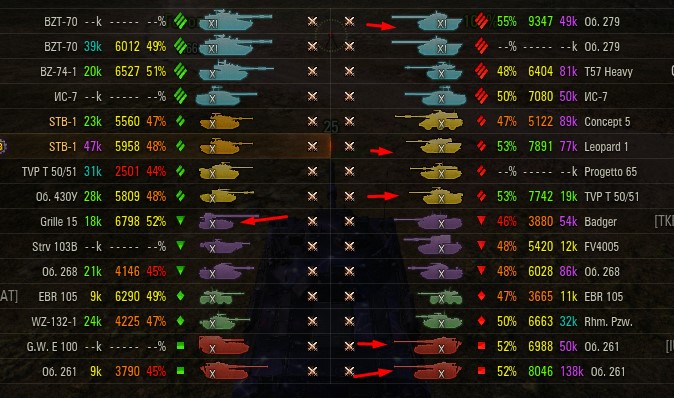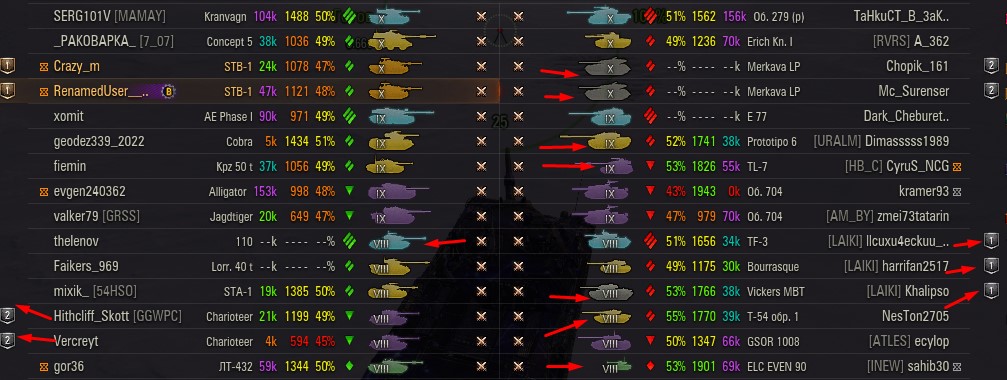 Отмечаются зеленых от 52% и выше по танку и общему скиллу. Скрытых после боя добавляю и то не всех. Если очевиден перевес скиловых, обычно первого скрытого. Уже не важно 6 или 8 зеленых против раков. Слив боя очевиден в 90%, быстрая скучная турбопобеда. В итоге зеленые так ломятся за халявной домажкой, что бывает друг дружку спихивают и толкают. Понимают что гринд будет не долгий, надо успеть набить на раках. Так же отмечены неравные взвода, которые в последние месяцы стали часто встречаться. Раньше подобное было редко, даже не скринил. Сейчас в каждом 4-5 бою. Таких скринов более 500 уже за пол года. Такой теперь новый баланс...