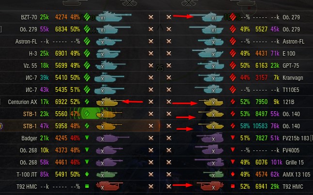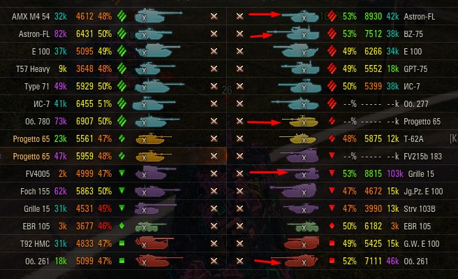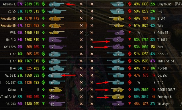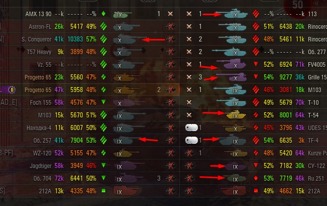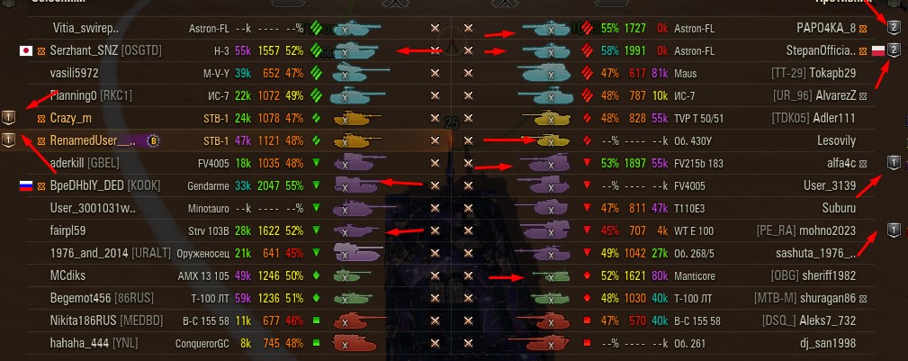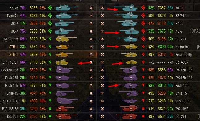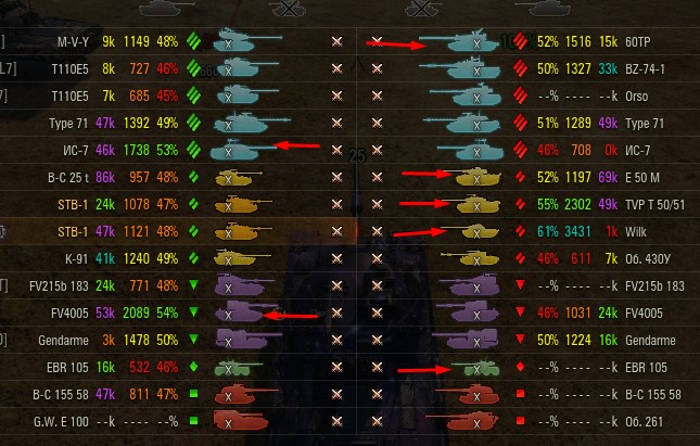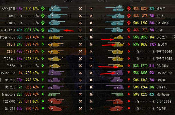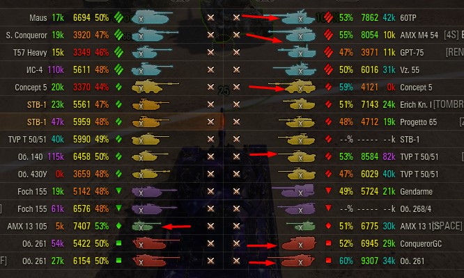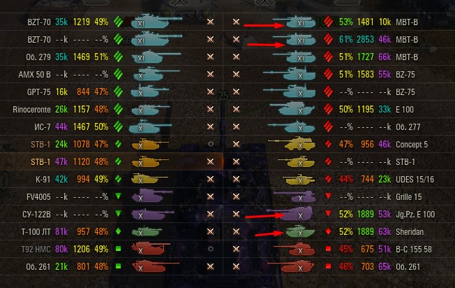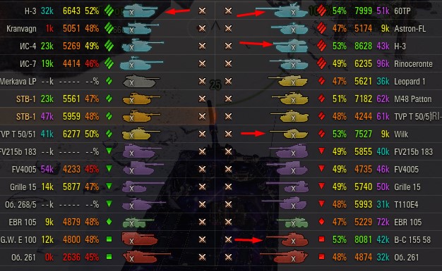 Отмечаются зеленых от 52% и выше по танку и общему скиллу. Скрытых после боя добавляю и то не всех. Если очевиден перевес скиловых, обычно первого скрытого. Уже не важно 6 или 8 зеленых против раков. Слив боя очевиден в 90%, быстрая скучная турбопобеда. В итоге зеленые так ломятся за халявной домажкой, что бывает друг дружку спихивают и толкают. Понимают что гринд будет не долгий, надо успеть набить на раках. Так же отмечены неравные взвода, которые в последние месяцы стали часто встречаться. Раньше подобное было редко, даже не скринил. Сейчас в каждом 4-5 бою. Таких скринов более 500 уже за пол года. Такой теперь новый баланс...