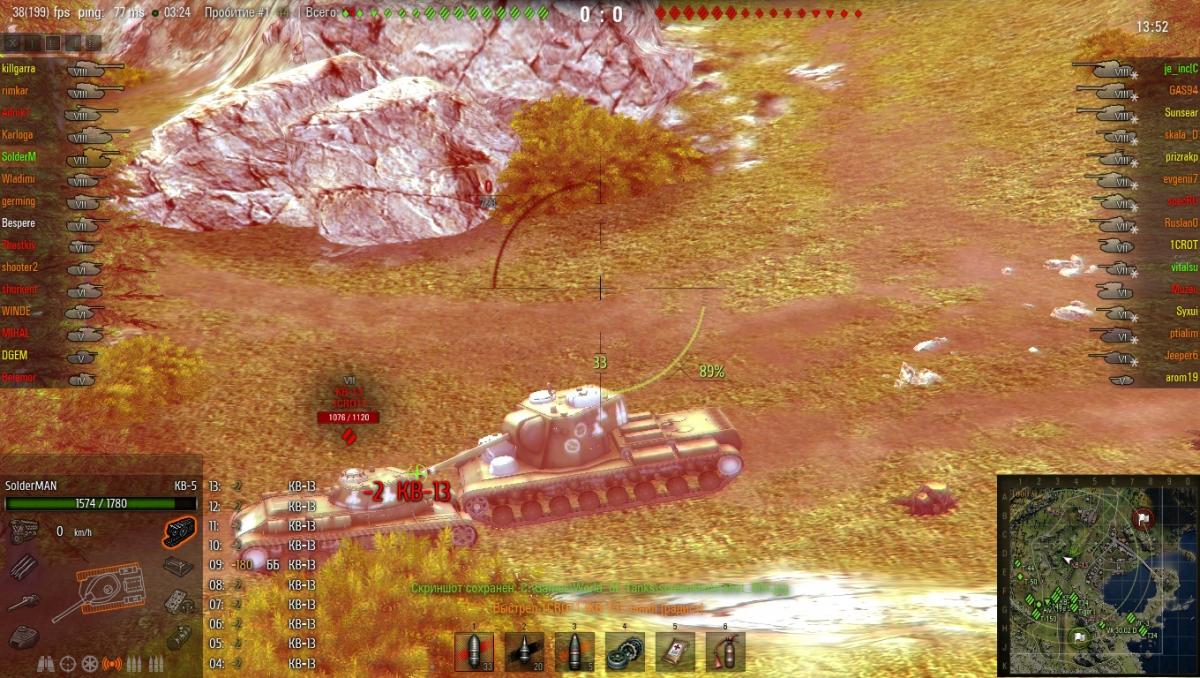 9. Я вчера писал на счет бага с тараном, когда вражеский или союзный танк притирается к вашей гусле боком и по вам проходит дамаг, тогда как по врагу или союзнику нет. Данный баг я замечал пока только на своем КВ-5(неоднократно) и один раз на союзном т95. На этот раз я с реплеем игры и скринами. Прошу оценить баг, а не мою игру(играл плохо). Реплей: http://wotreplays.ru/site/1804713?secret=8e23aac889960c85abdd7bcc8d40680b
