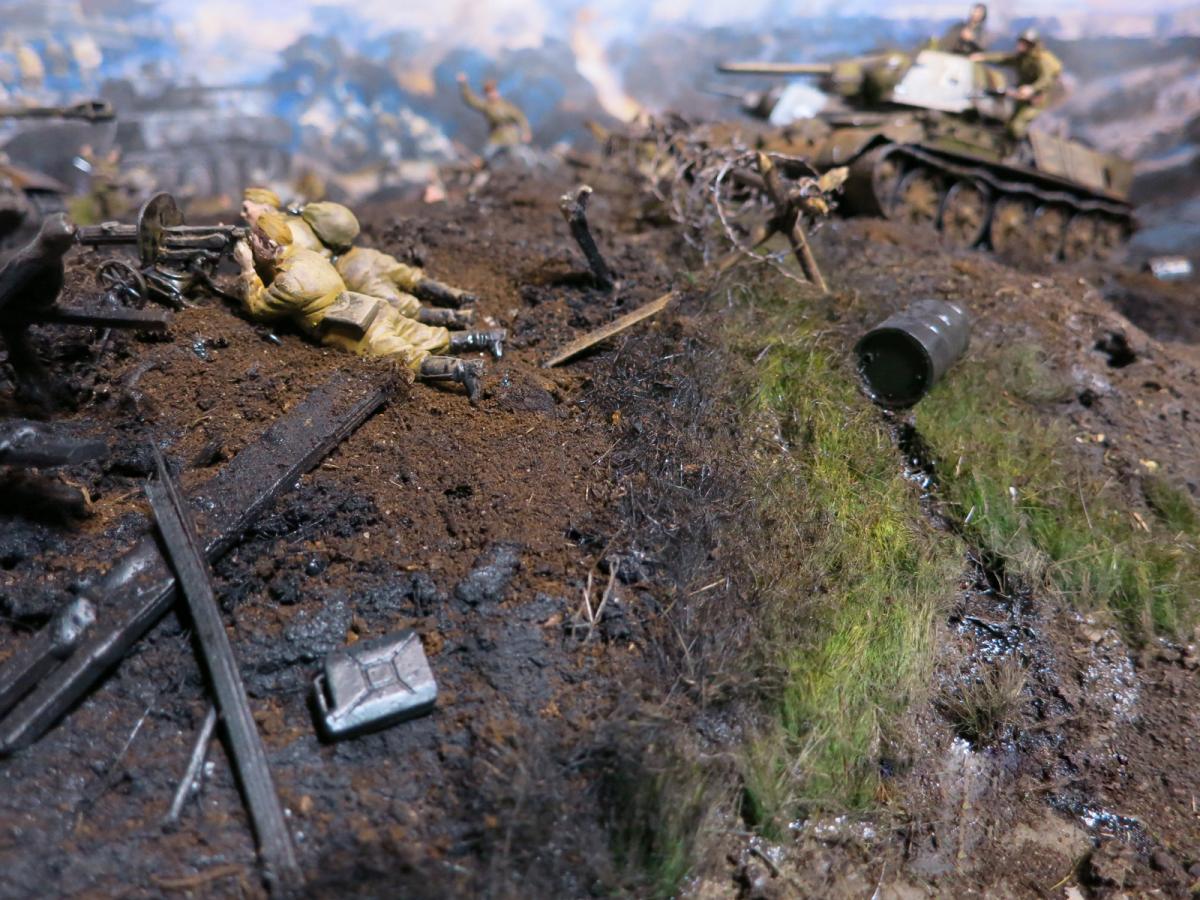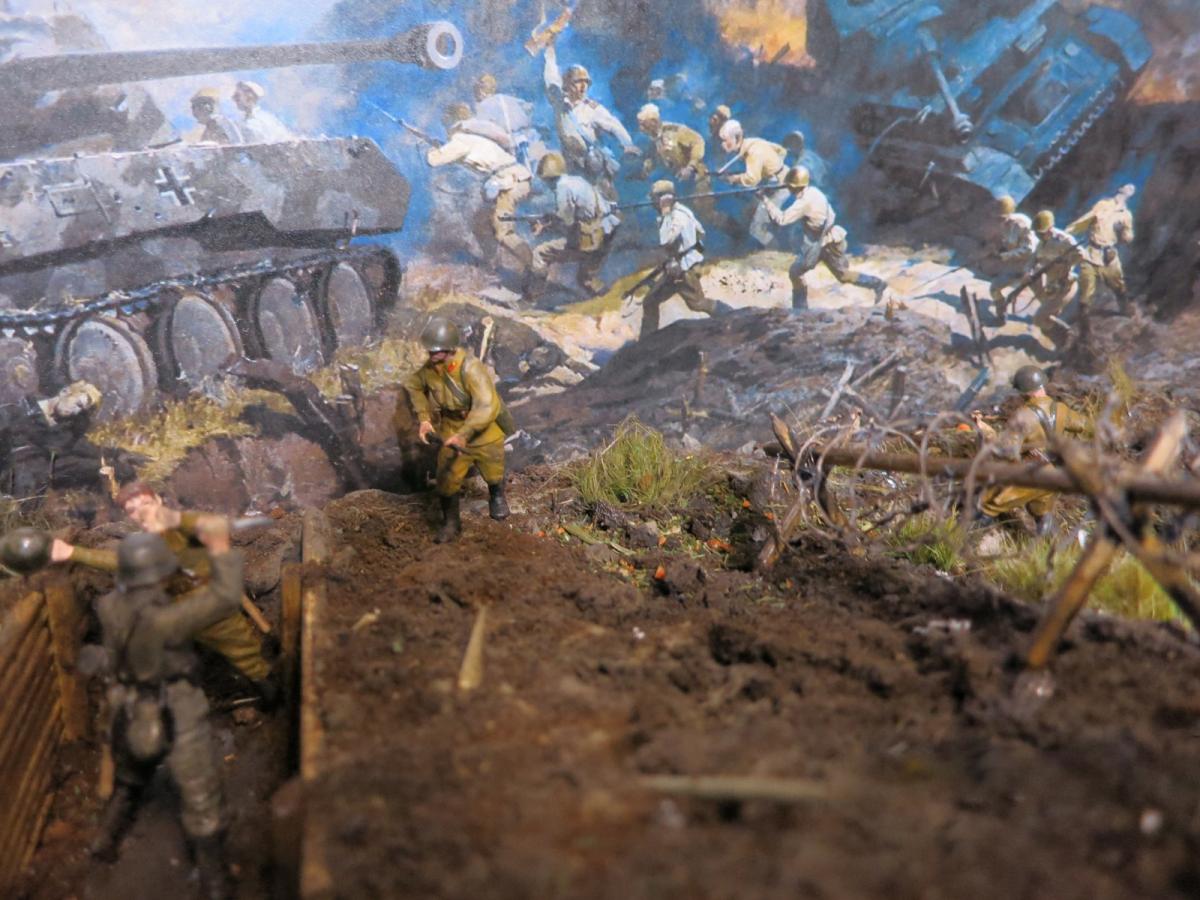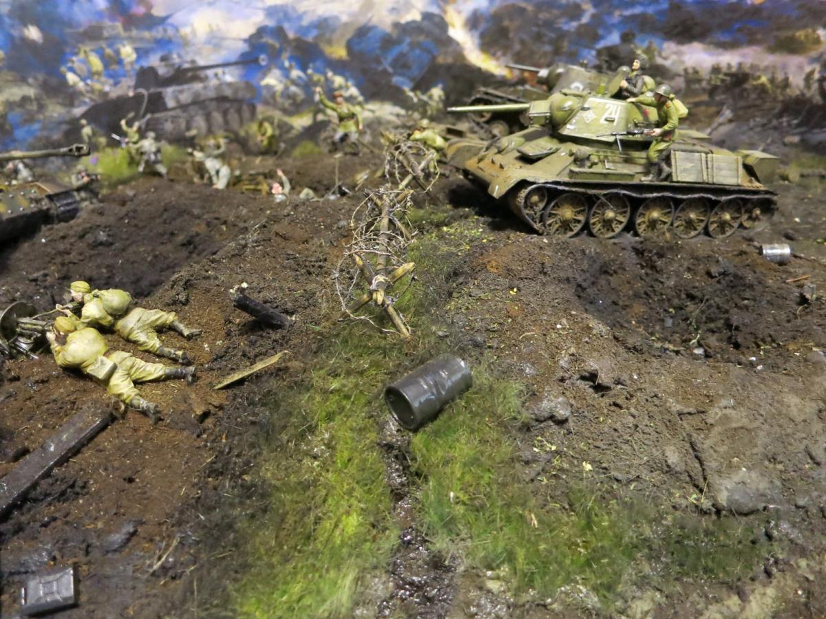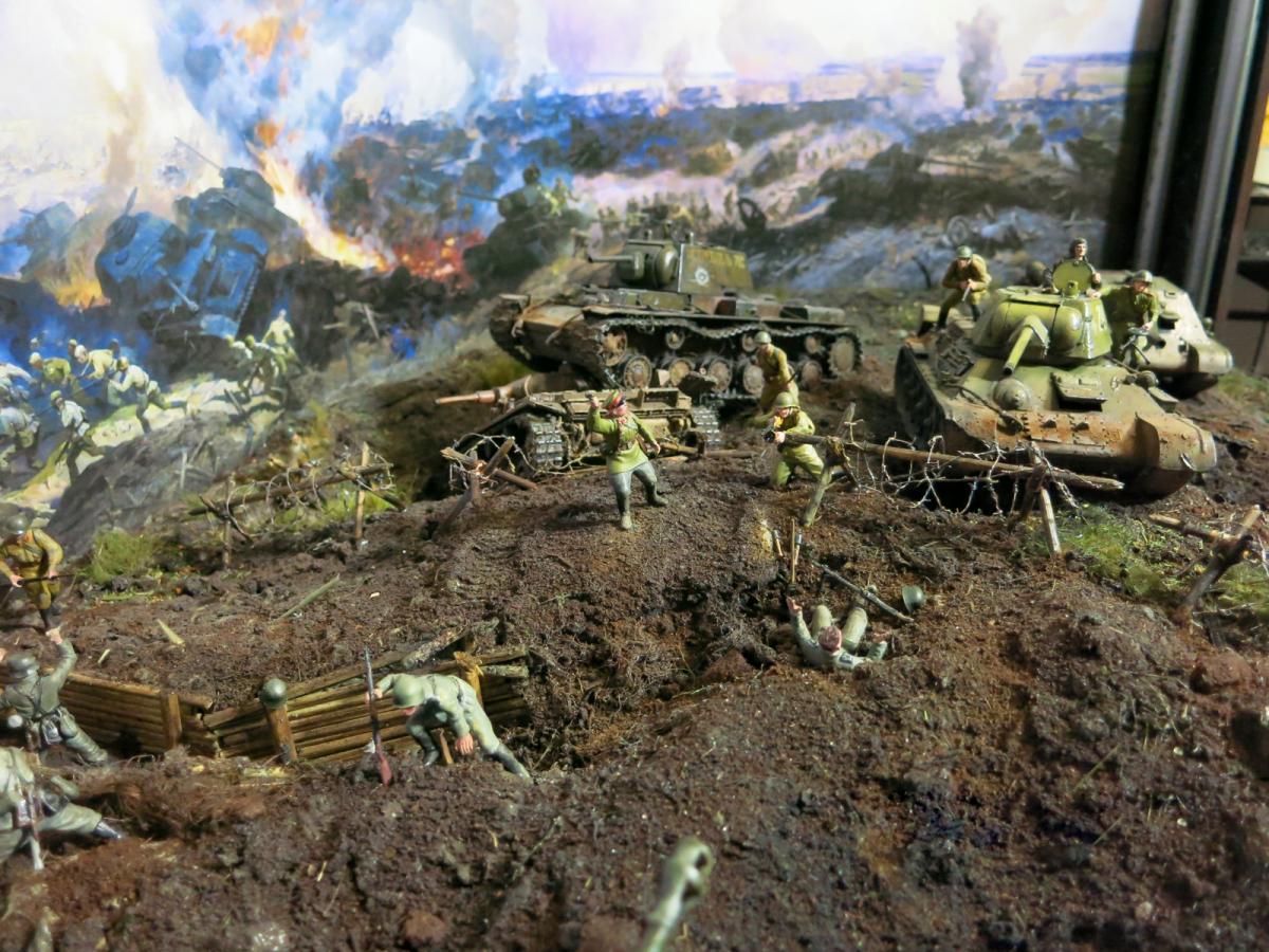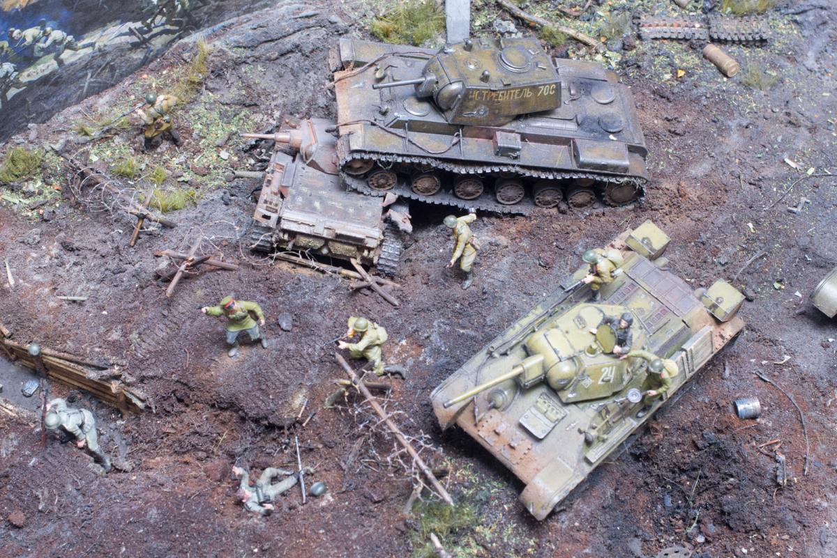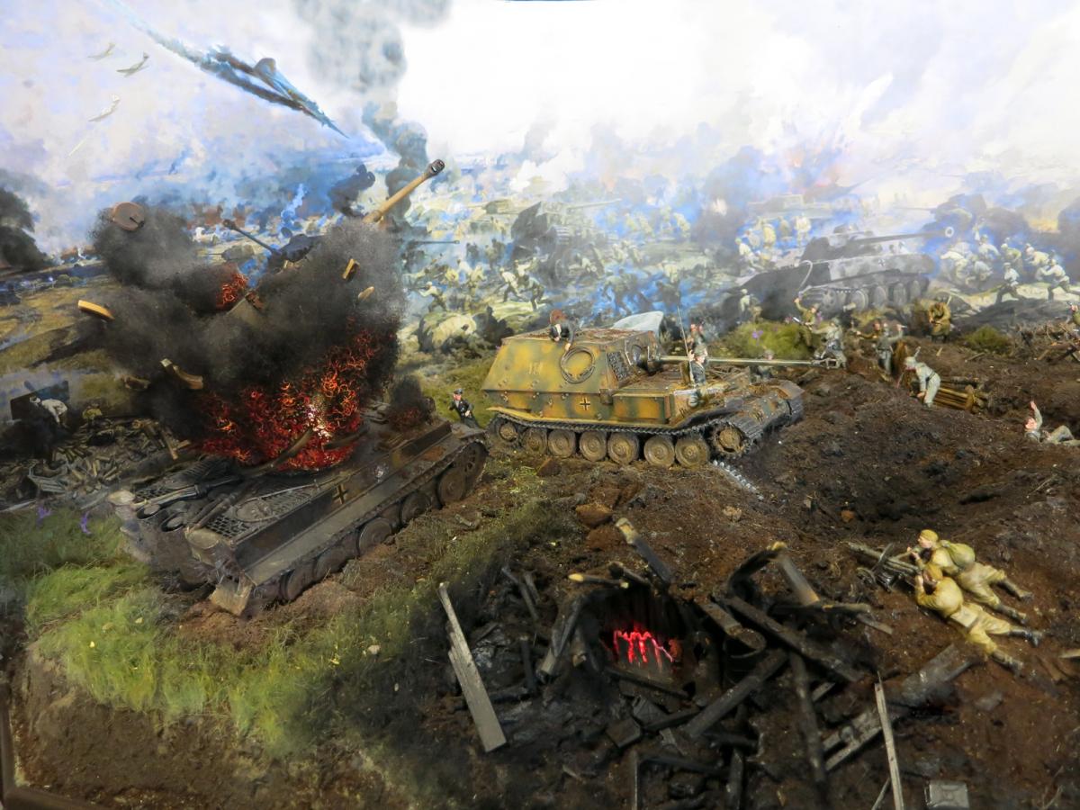 Модели собирал первый раз.Полгода стояли некрашеные. В преддверии 70 летия победы решил сделать диораму.Прошлым летом был в г.Белгороде, очень понравилась диорама Курской битвы, вот на её основе и решил попробовать. Красил красками Акан, Тамия, немного Звезда и разные колеры из хозмага. Аэрограф был Тамиевский (с баллончиком), баллончик быстро кончился и вместо компрессора использовал ручную брызгалку для цветов.Когда мышцы на обеих руках накачались как у Шварца решил купить новый аэрограф и компрессор. Работу начал 1 февраля 2015г. Много очень было неизвестного, помог интернет и ваш сайт. Почти все- и модели и основание перекрашивал несколько раз. Фигурки и некоторые модели собирал сын, поэтому пришлось наспех доделывать, дотачивать(это когда я уже начитался советов и требований). Одновременно начал делать другую диораму, поменьше, поэтому времени было мало. Основание - монтажная пена, гипс, ПВА. Трава - сантехнический лен. Взрыв - синтепон.Не придерживался технической информации по моделям, только по истории.