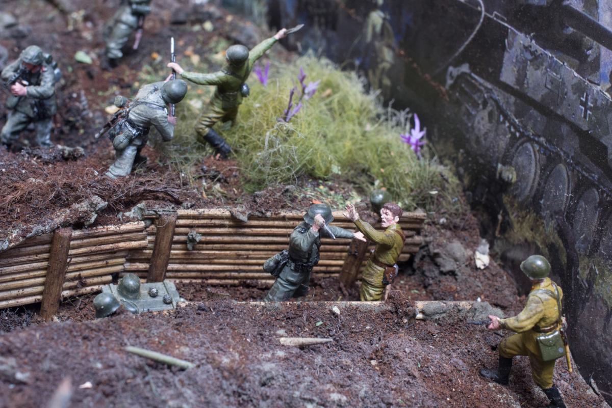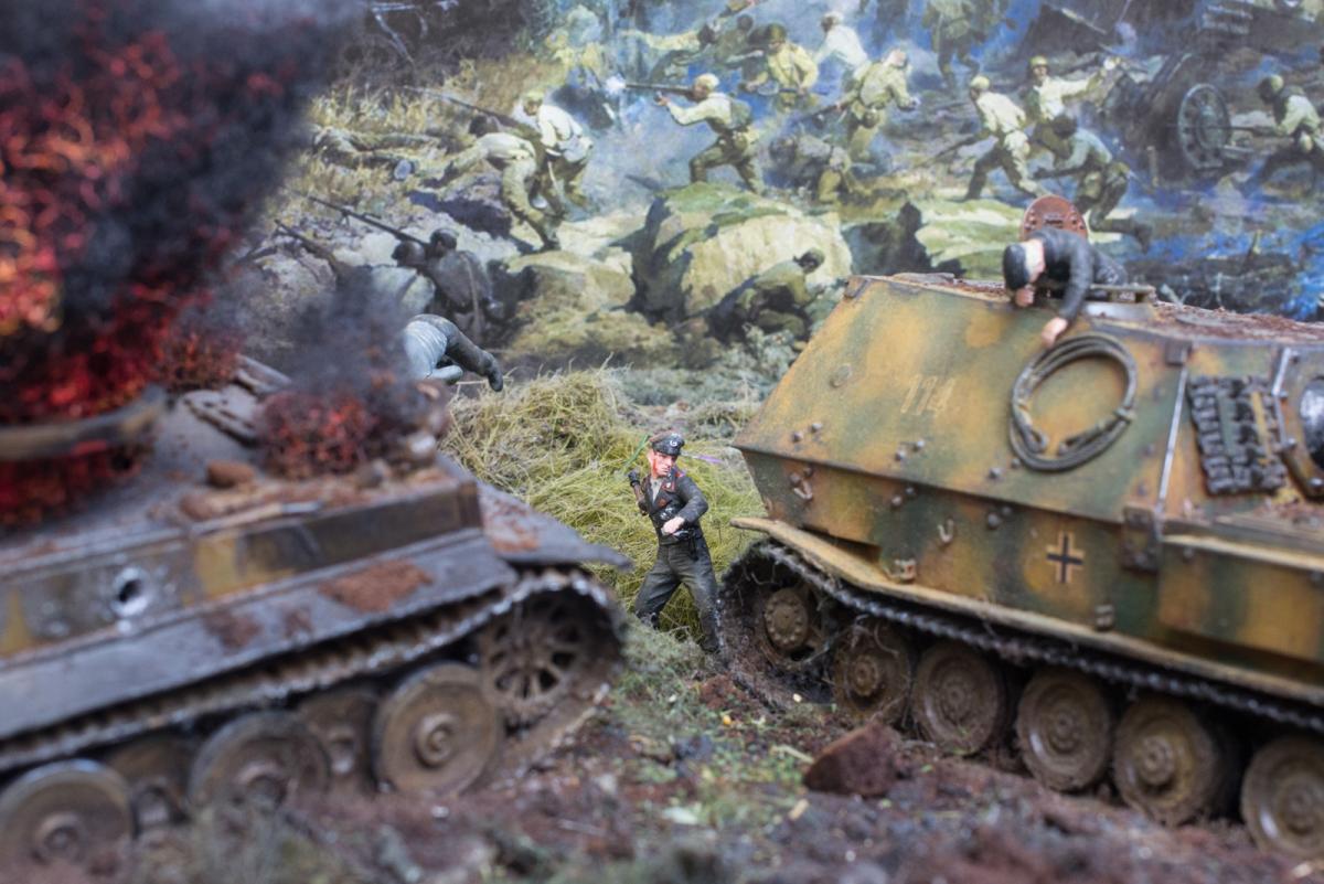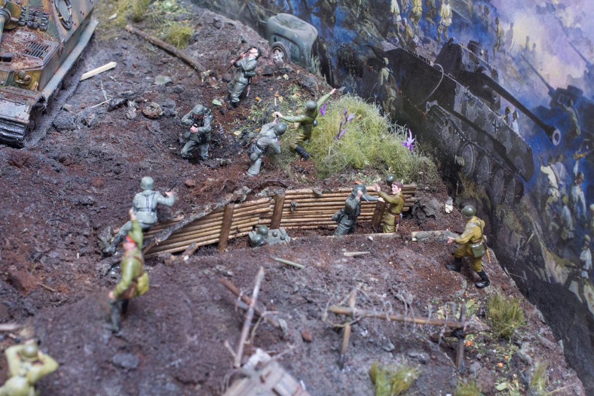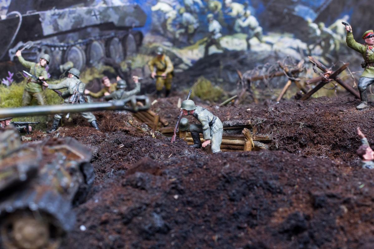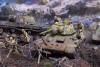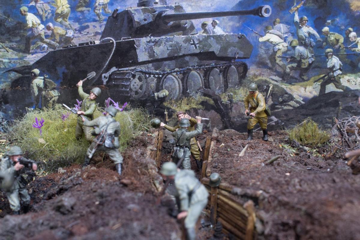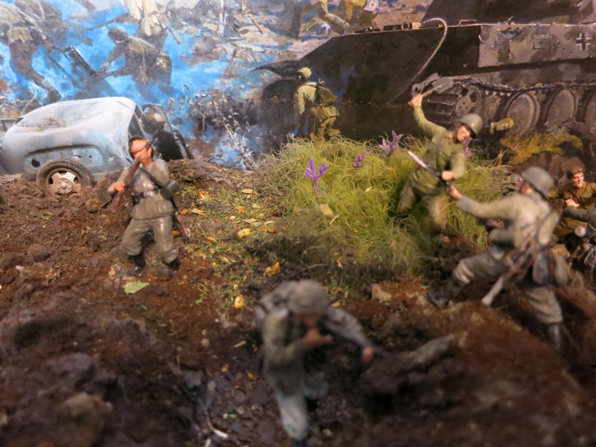 Модели собирал первый раз.Полгода стояли некрашеные. В преддверии 70 летия победы решил сделать диораму.Прошлым летом был в г.Белгороде, очень понравилась диорама Курской битвы, вот на её основе и решил попробовать. Красил красками Акан, Тамия, немного Звезда и разные колеры из хозмага. Аэрограф был Тамиевский (с баллончиком), баллончик быстро кончился и вместо компрессора использовал ручную брызгалку для цветов.Когда мышцы на обеих руках накачались как у Шварца решил купить новый аэрограф и компрессор. Работу начал 1 февраля 2015г. Много очень было неизвестного, помог интернет и ваш сайт. Почти все- и модели и основание перекрашивал несколько раз. Фигурки и некоторые модели собирал сын, поэтому пришлось наспех доделывать, дотачивать(это когда я уже начитался советов и требований). Одновременно начал делать другую диораму, поменьше, поэтому времени было мало. Основание - монтажная пена, гипс, ПВА. Трава - сантехнический лен. Взрыв - синтепон.Не придерживался технической информации по моделям, только по истории.