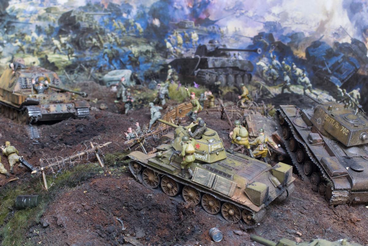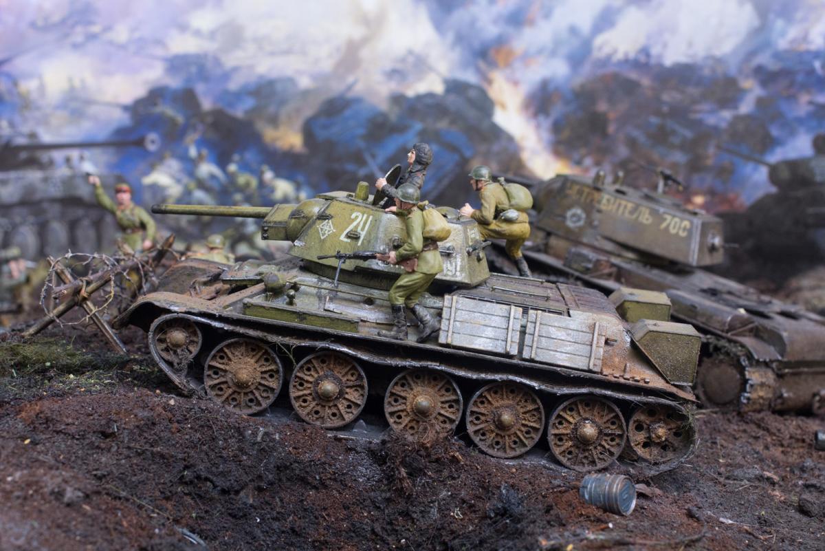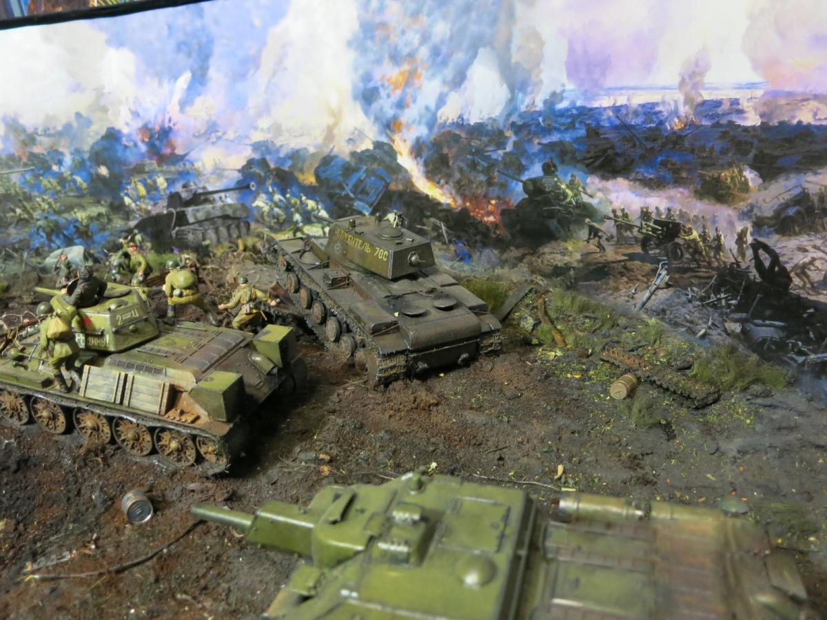 На диораме я хотел показать не определенные островки с нужными там танками, а многие машины участвовавшие в битве и которые на данный момент у меня были собраны (докупил только су 122). Напоминаю, что это моя первая диорама и копаться в "полном хаосе обозначений" абсолютно неинтересно, пока. Мне с детства нравится тема ВОВ, много прочитано, просмотрено и чего только где не было, что и кто с кем либо где не встречался-это война, хаос, неразбериха. Утверждать что эти машины не могли встретиться или обратное я думаю мы не можем, мы там не были. Соблюдать примерный порядок и похожесть по времени-этого я стараюсь придерживаться. Я не поставил сюда СУ 100, ИСУ 152, Т 34-85 или ИС 2. Все. А остальное всё было-где и как - история до сих пор разобраться не может.