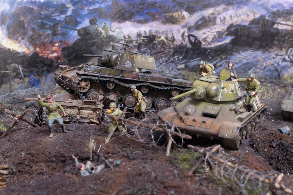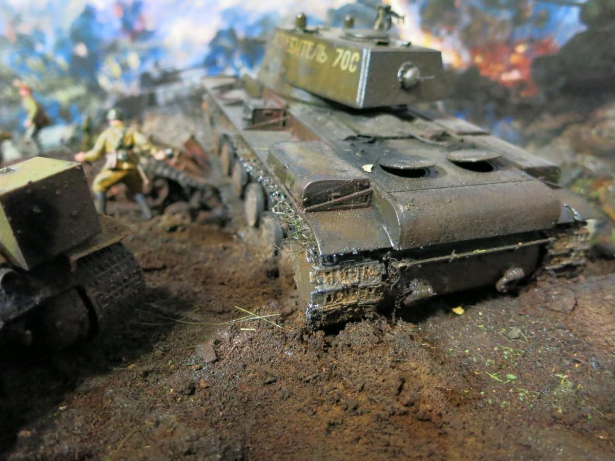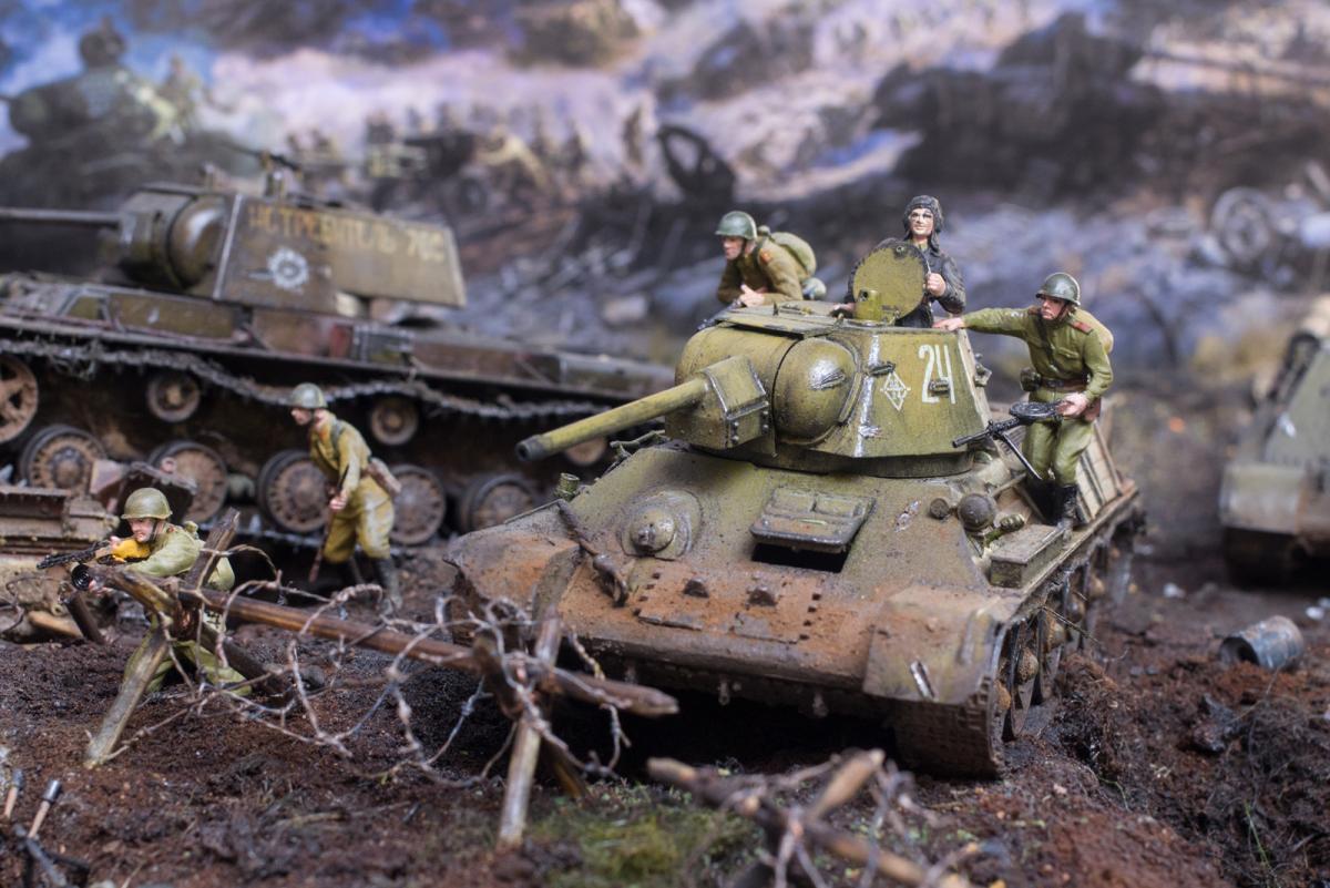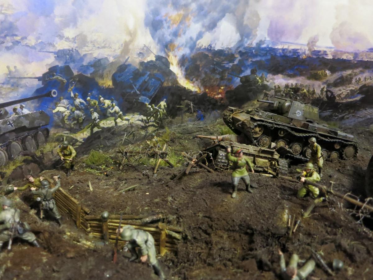 На диораме я хотел показать не определенные островки с нужными там танками, а многие машины участвовавшие в битве и которые на данный момент у меня были собраны (докупил только су 122). Напоминаю, что это моя первая диорама и копаться в "полном хаосе обозначений" абсолютно неинтересно, пока. Мне с детства нравится тема ВОВ, много прочитано, просмотрено и чего только где не было, что и кто с кем либо где не встречался-это война, хаос, неразбериха. Утверждать что эти машины не могли встретиться или обратное я думаю мы не можем, мы там не были. Соблюдать примерный порядок и похожесть по времени-этого я стараюсь придерживаться. Я не поставил сюда СУ 100, ИСУ 152, Т 34-85 или ИС 2. Все. А остальное всё было-где и как - история до сих пор разобраться не может.